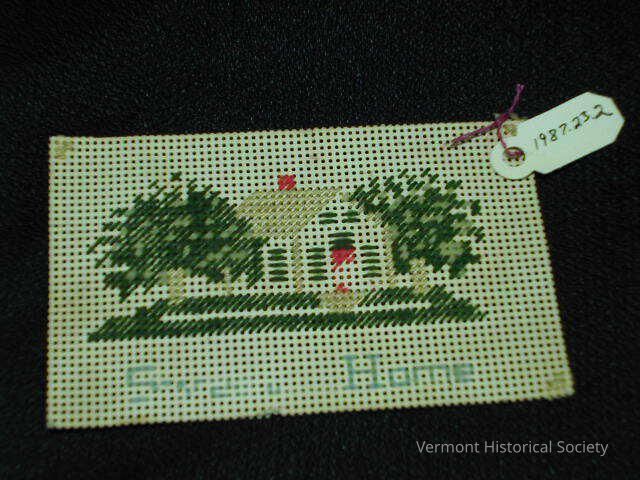 Needlework design on a punched paper card. The design is a house flanked by trees. The words, "Sweet Home", are stitched along the bottom.