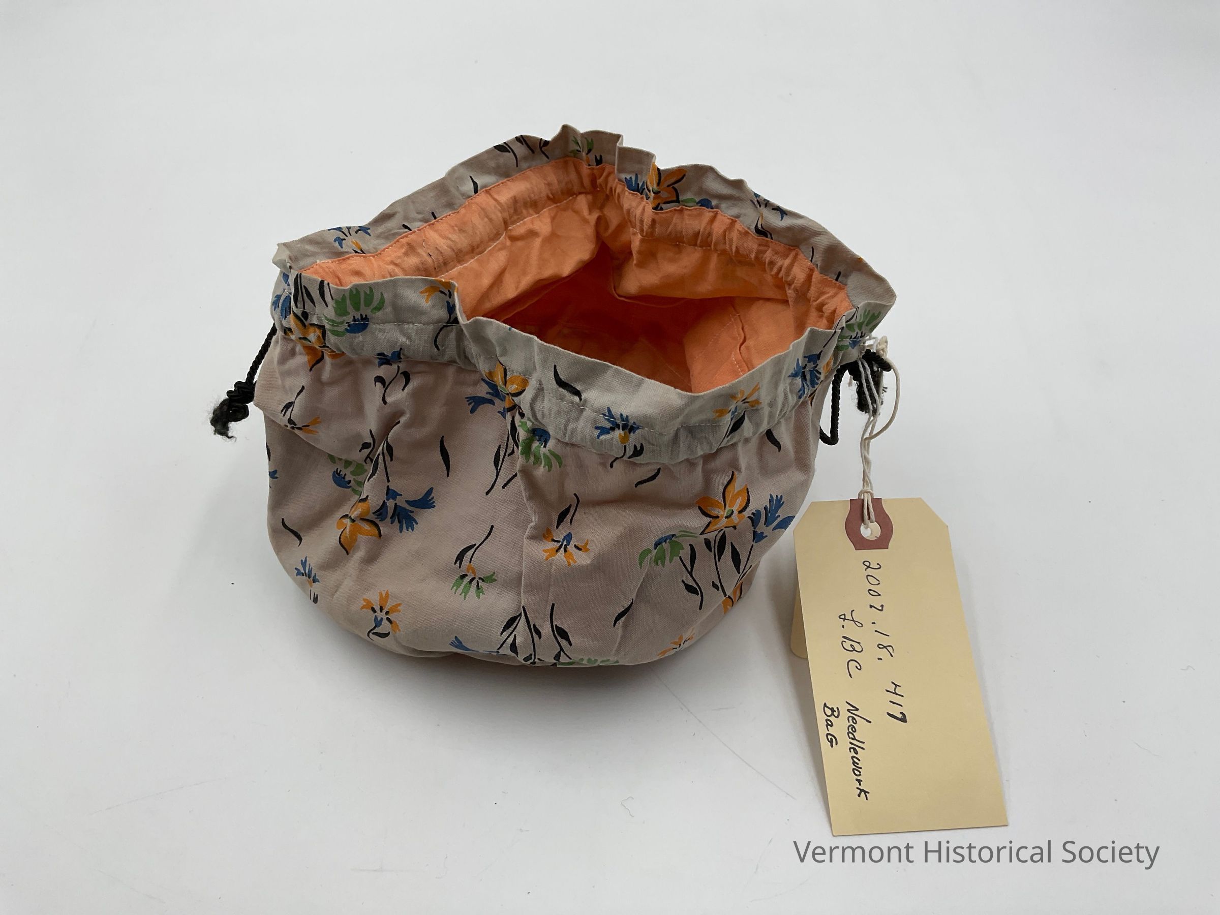 This is a needlework bag. It is predominantly gray in color and printed with orange and blue flowers. The bag features an orange lining. To secure the contents, it is equipped with a black drawstring closure. Inside the bag, there are leather holders specifically designed to hold scissors and a packet of needles. Additionally, there are pockets along the interior to conveniently store spools of thread.