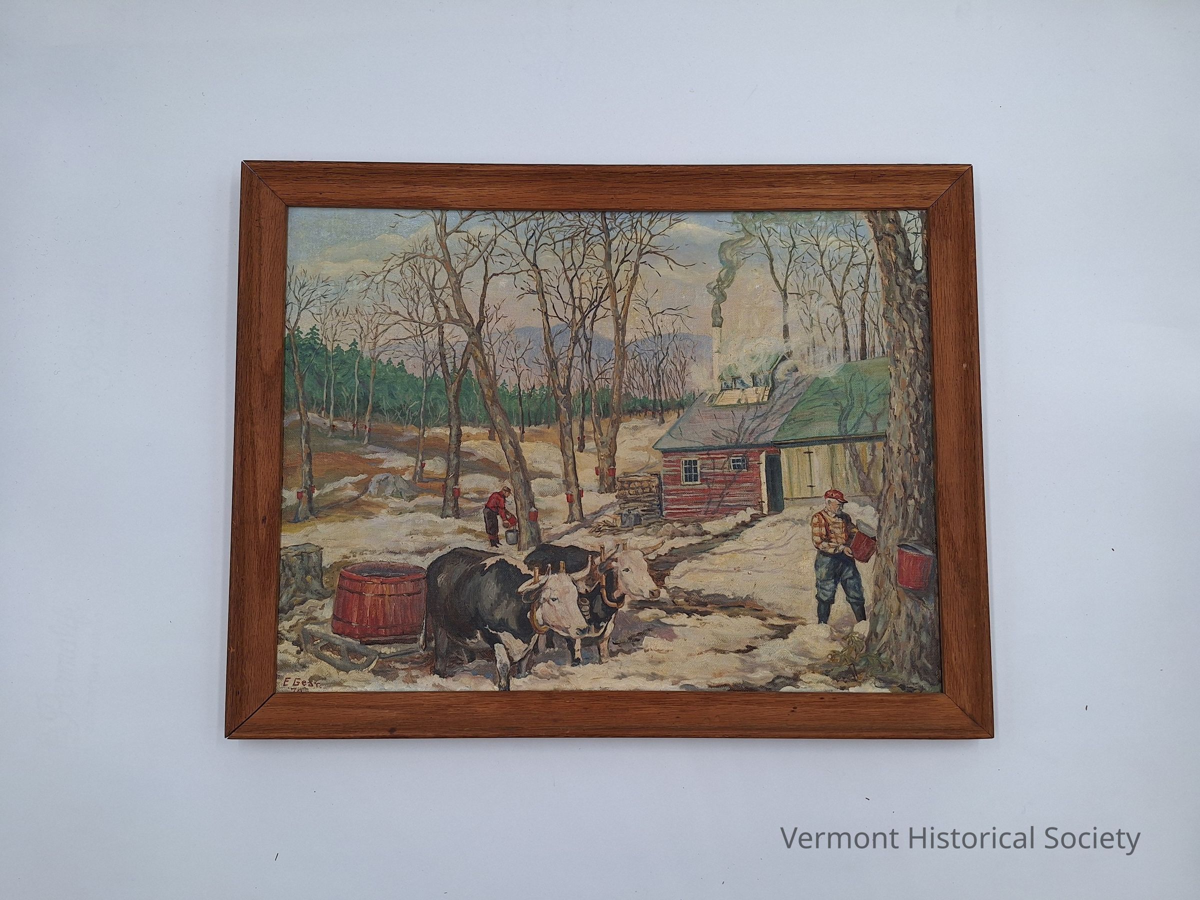 Oil painting entitled "Sugaring" by Ethel T. Gear. Painting shows a steaming sugarhouse, two men in plaid checking sap buckets hanging on trees and a pair of oxen pulling a sled with a barrel of sap.Artwork Details