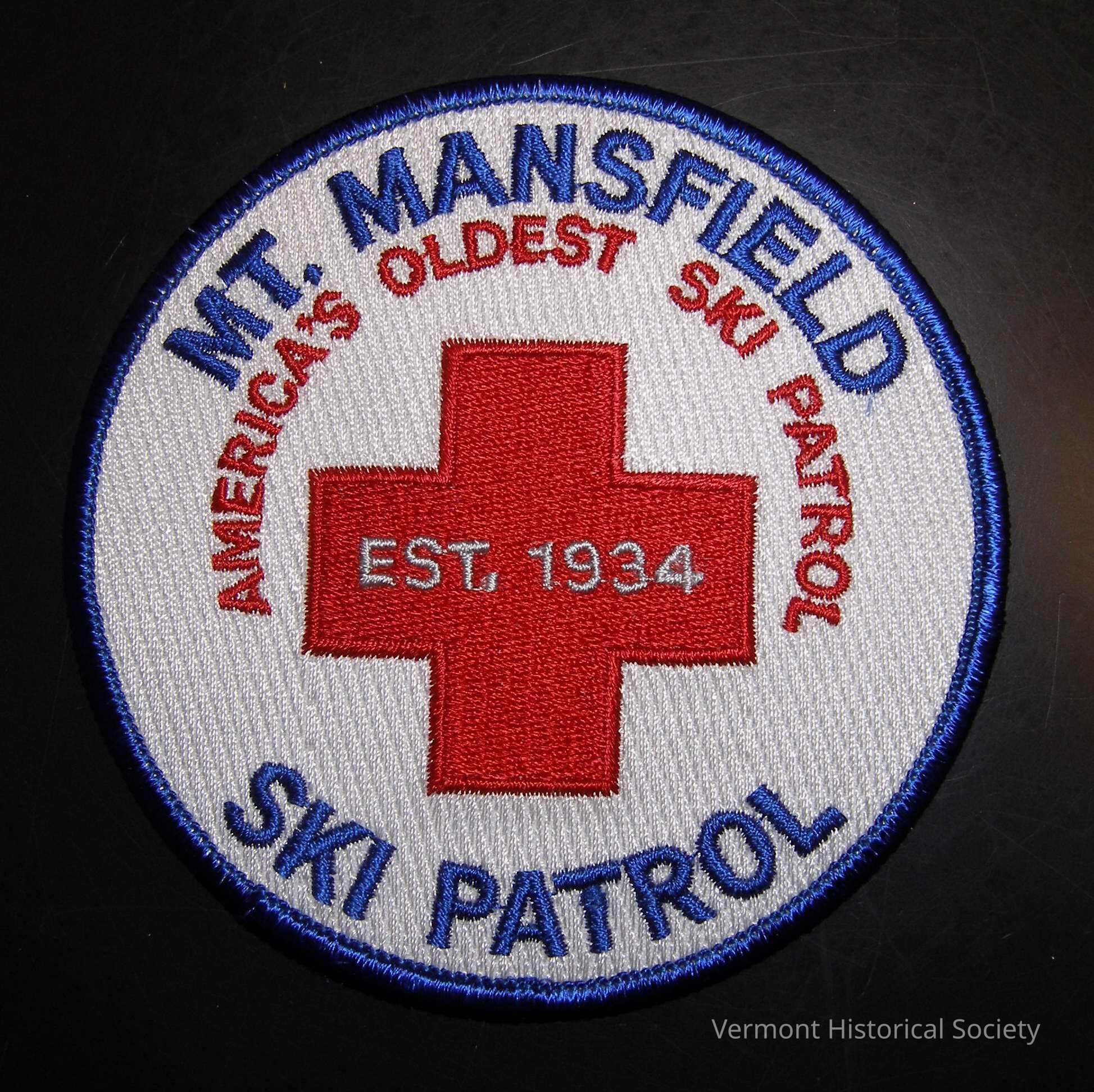 "Mt. Mansfield Ski Patrol / America's Oldest Ski Patrol" patch. Round red, white and blue embroidered. Large red cross in center imprinted: "EST. 1934" See Worksheet file for historyContext