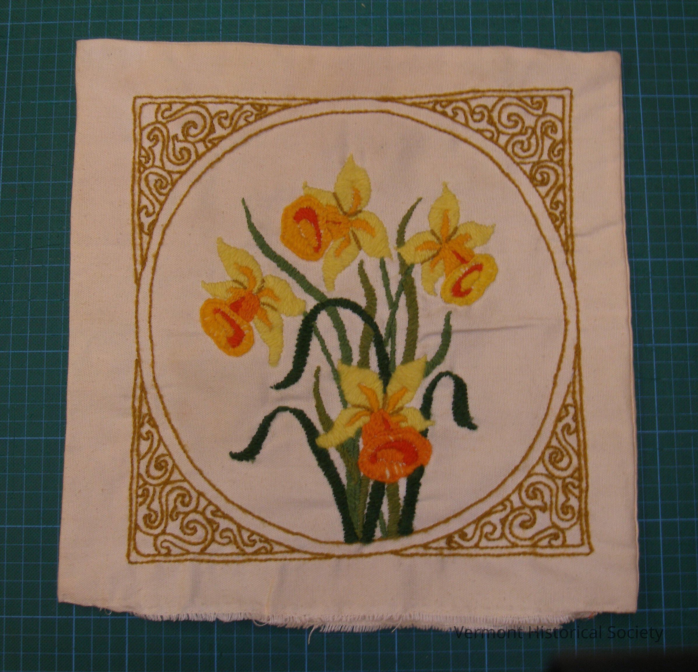 Unfinished embroidered throw pillow. In the center is a crewel-embroidered spray of daffodils in shades of yellow and orange, with long narrow leaves in shades of green. This is encircled with a chain of gold and in the four corners, triangles of gold scrolled embroidery. The bottom edge of the case is the opening, which is frayed.Context
