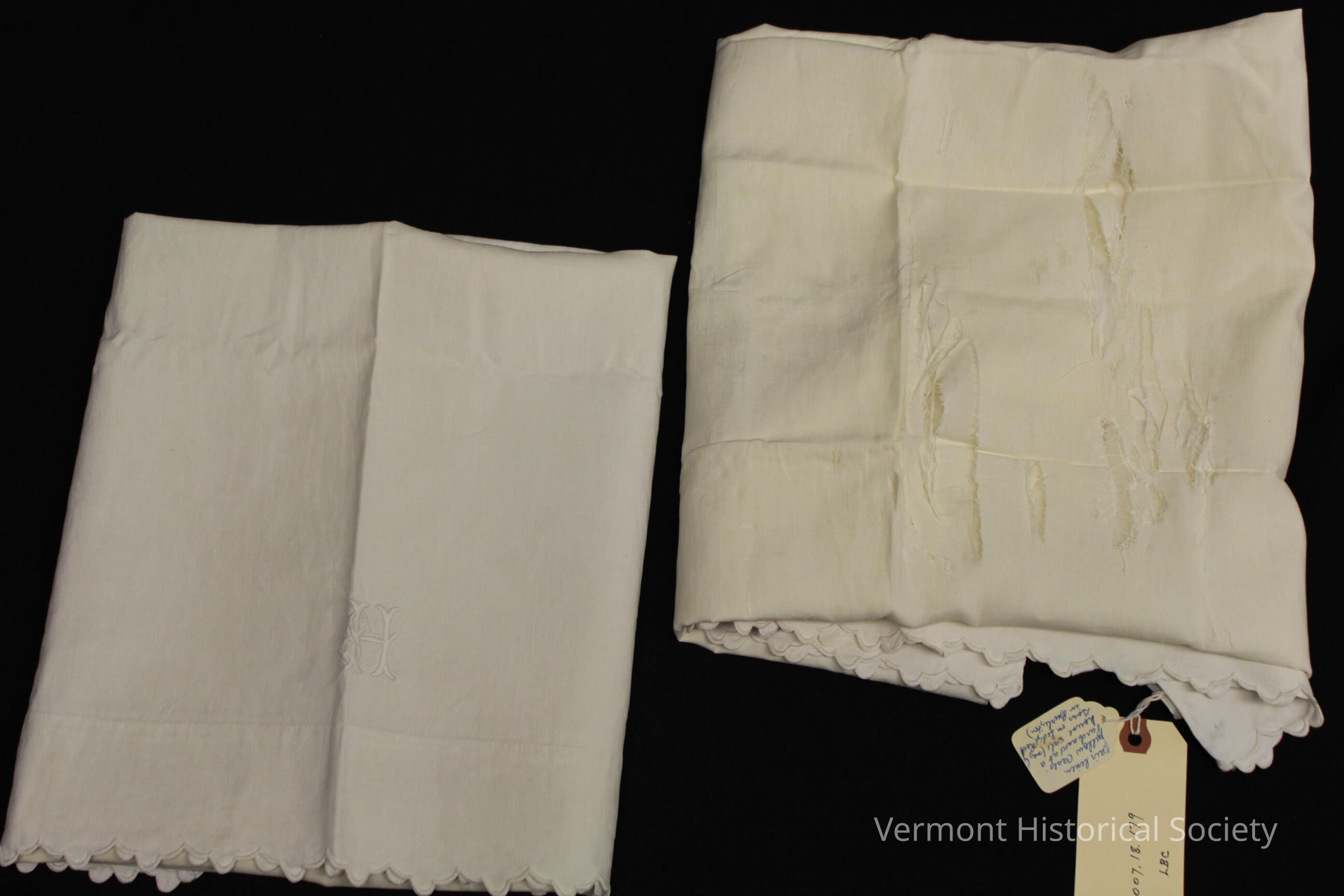Pair of white linen pillowcases with scalloped edges. they each have an embroidered "H" on them.Context