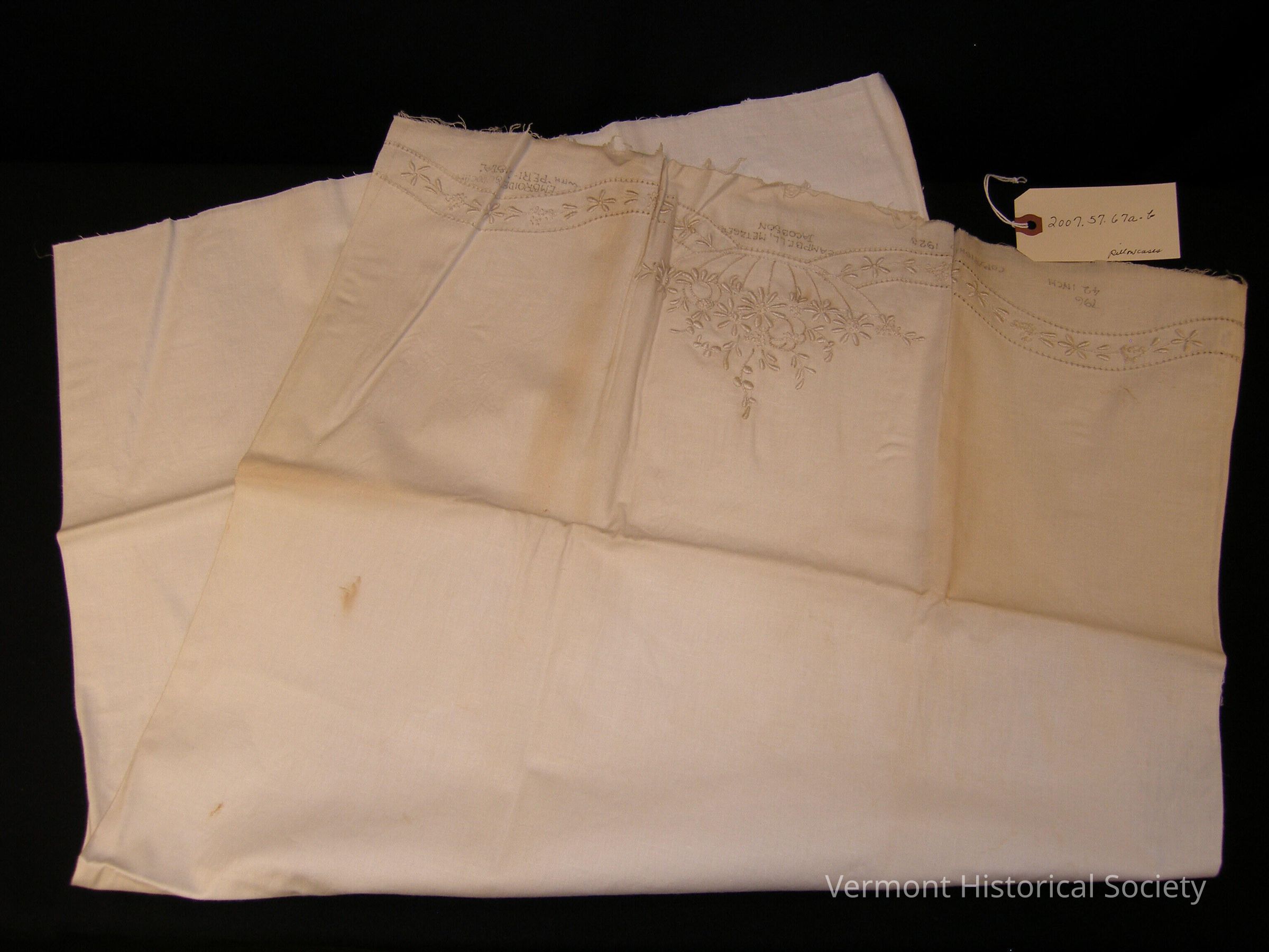 Pair of unfinished white linen pillowcases. Each pillowcase is decorated along the opening edge with whitework embroidery in a floral pattern. The edges are left unhemmed. The unstitched hem is printed with the label, "796 42 inch COPYRIGHTED 1923 CAMPBELL, METZGER JACOBSON EMBROIDER & CROCHET WITH 'PERI-LUSTA'."Context