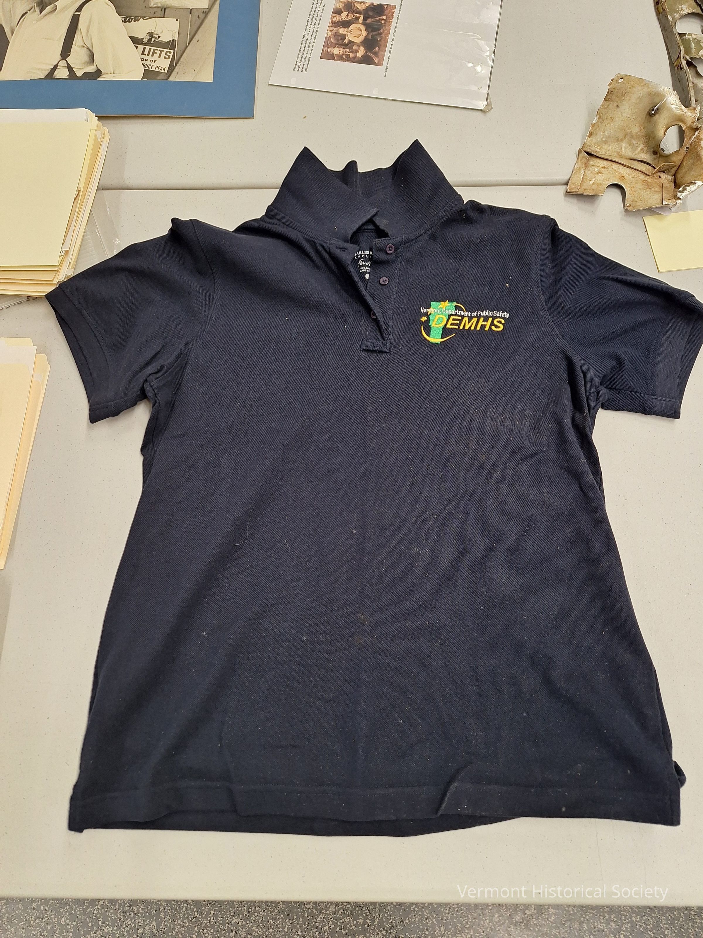 Black polo shirt with short sleeves and a collar. On the right front is a logo in yellow, green and white Vermont Department of Public Safety's division of emergency management and homeland security (DEMHS)