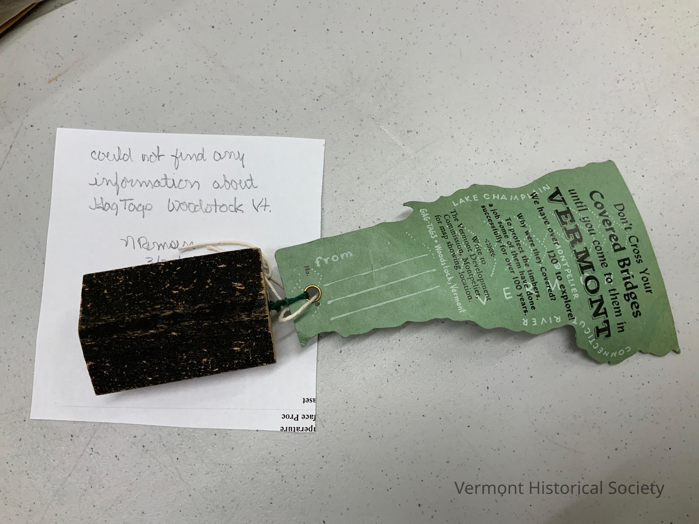 Postcard cut into the shape of the state of Vermont attached to a miniature wooden covered bridge. The postcard is printed with the inscription, "Don't Cross Your Covered Bridges until you come to them in VERMONT." On the other side is a space for writing a mailing address and placing a stamp. The bridge has a black roof and red sides.