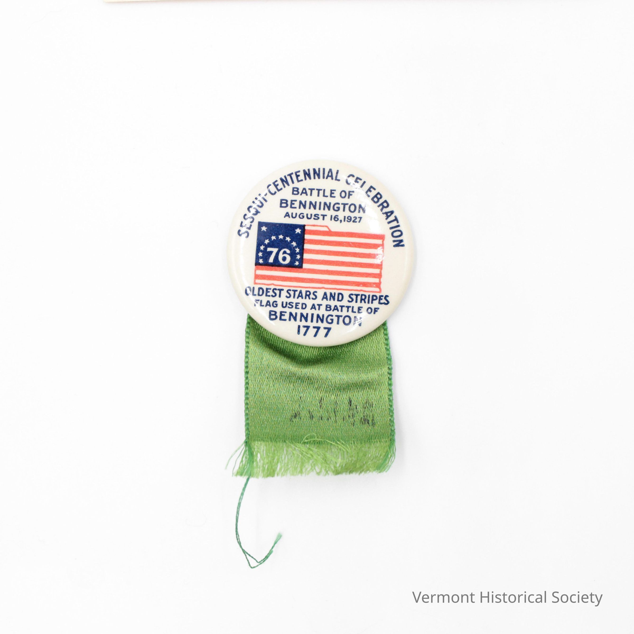 Round, white metal button printed with a United States flag with 13 stars and the number 76 in the blue field. The inscription, 'SESQUI-CENTENNIAL CELEBRATION / BATTLE OF BENNINGTON AUGUST 16, 1927 / OLDEST STARS AND STRIPES FLAG USED AT BATTLE OF BENNINGTON 1777" surround the flag. A green satin-woven silk ribbon hangs from the button. There is a piece of cardboard inserted into the back of the button beneath the pin with the makers mark.Context
