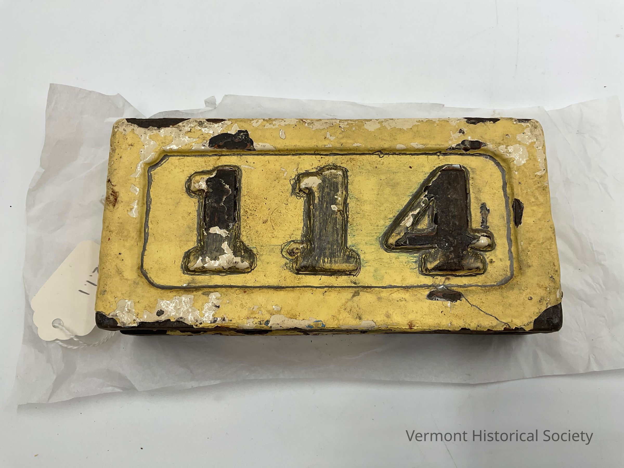 Yellow-painted metal plaque molded with the number 114. There are two large bolts through either side.