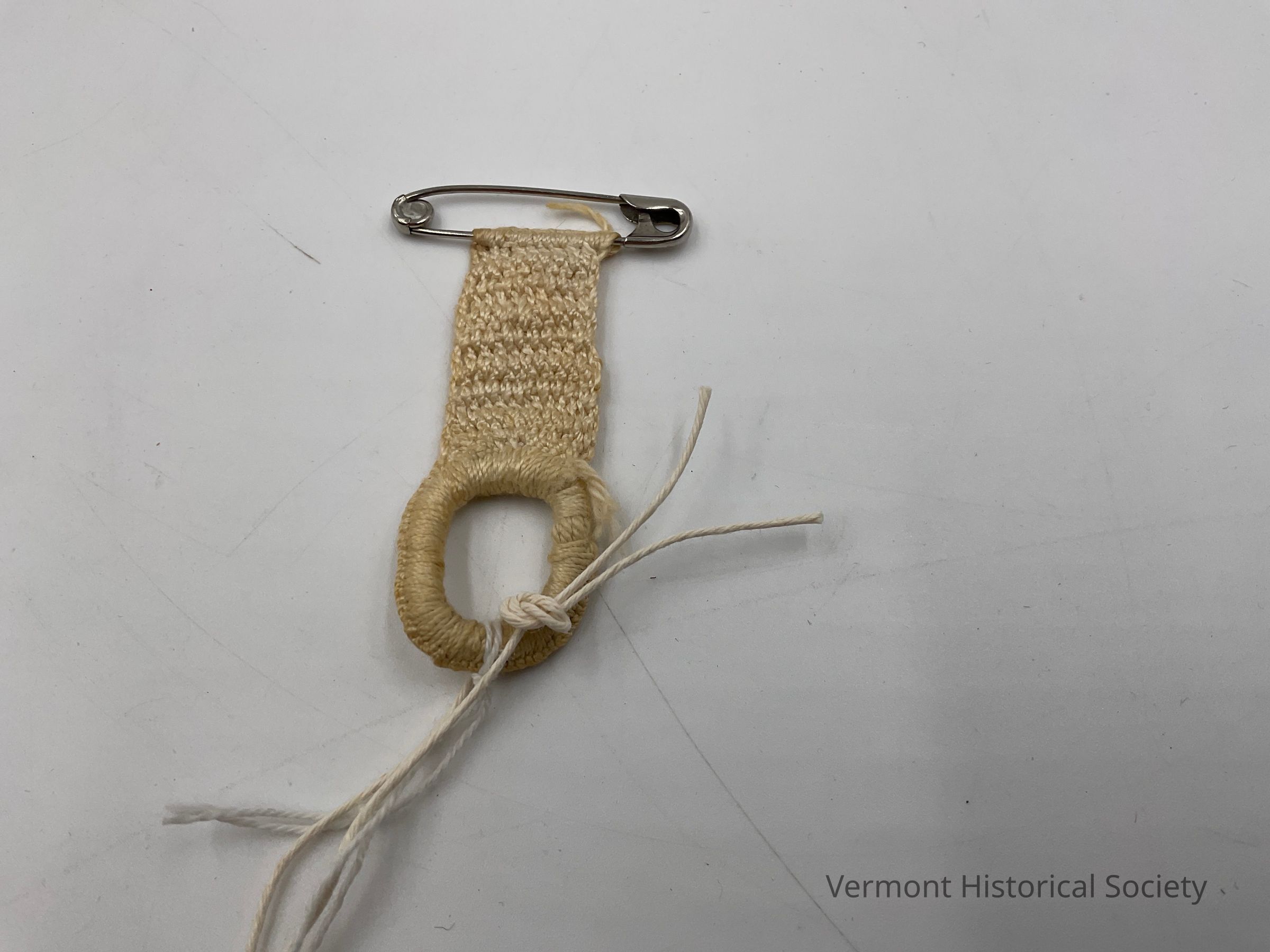 Shawl pin consisting of a ring covered in thread attached to a safety pin by a strip of crochet.