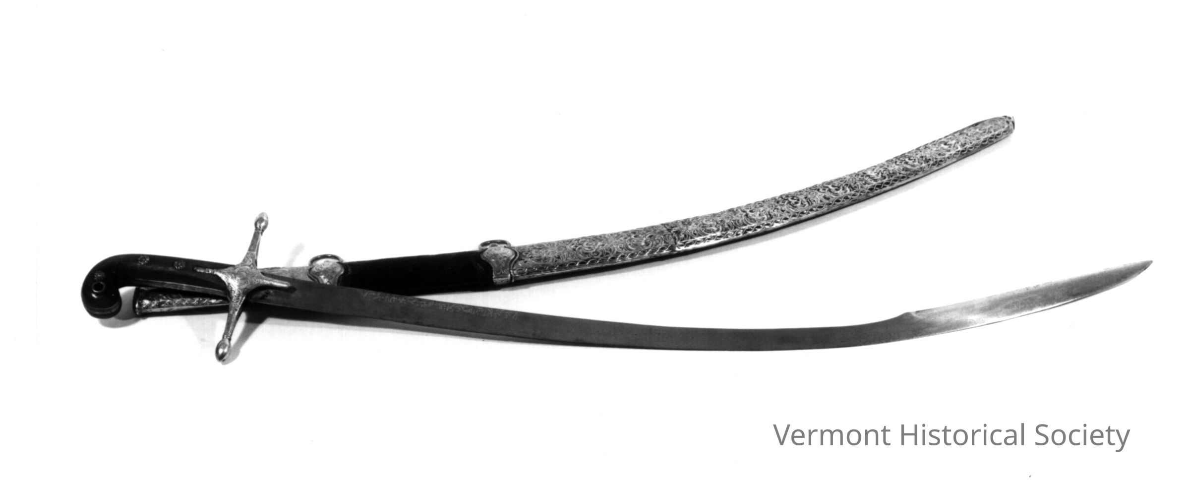 Curved sword and scabbard. The sword has an Arabic inscription and an English initial (B) is engraved onto the hilt. The sword blade curves into a point, with a "heel" about a quarter up from the point. The handle has a straight rain guard and a pistol grip with three brass rosettes on each side. The scabbard is chased silver in a pattern or repeating, stylized flowers.Context