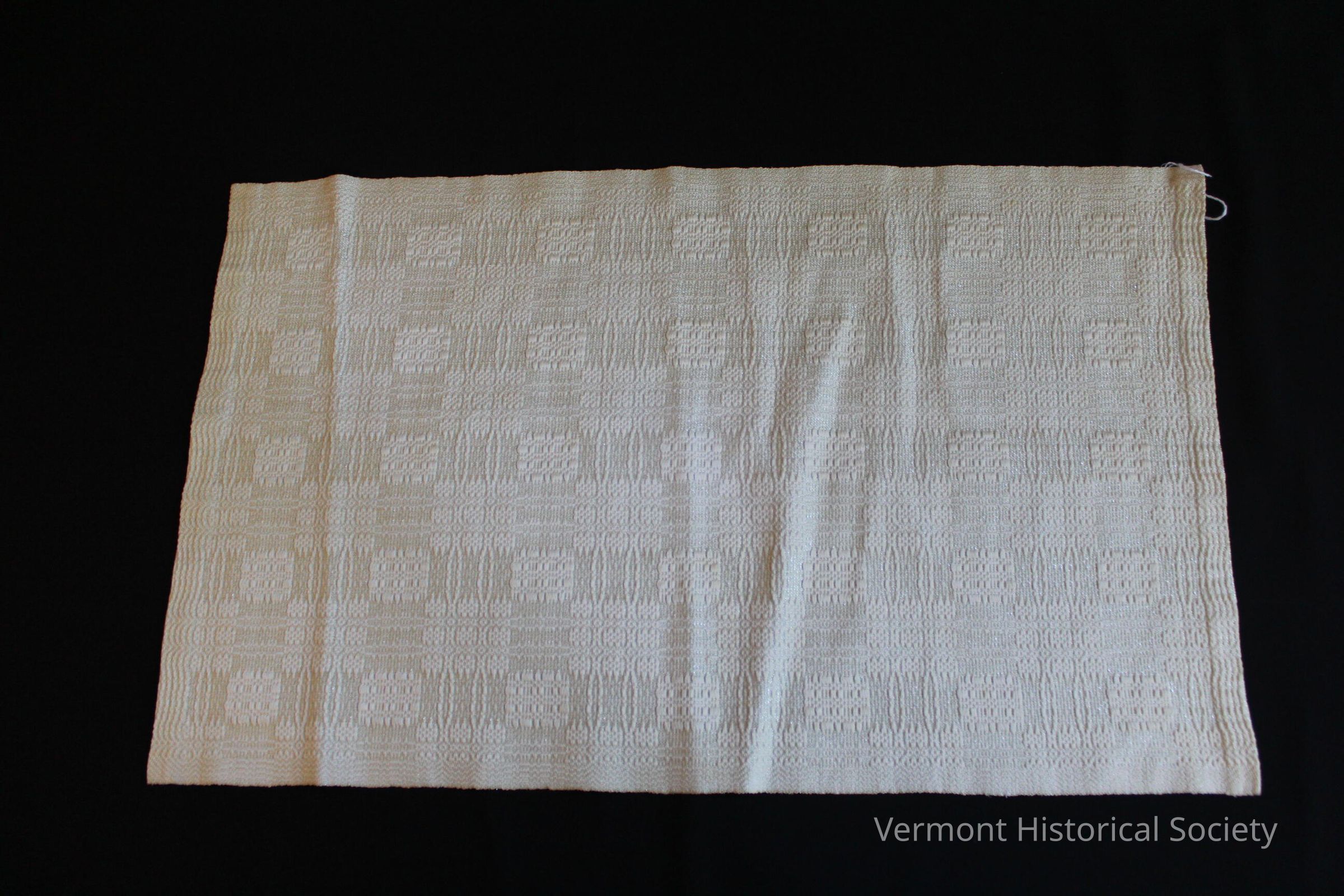 White overshot table mat woven with metallic threads. A tag on one end reads, "HANDWOVEN BY THE SPRAGUE'S BARRE, VERMONT".