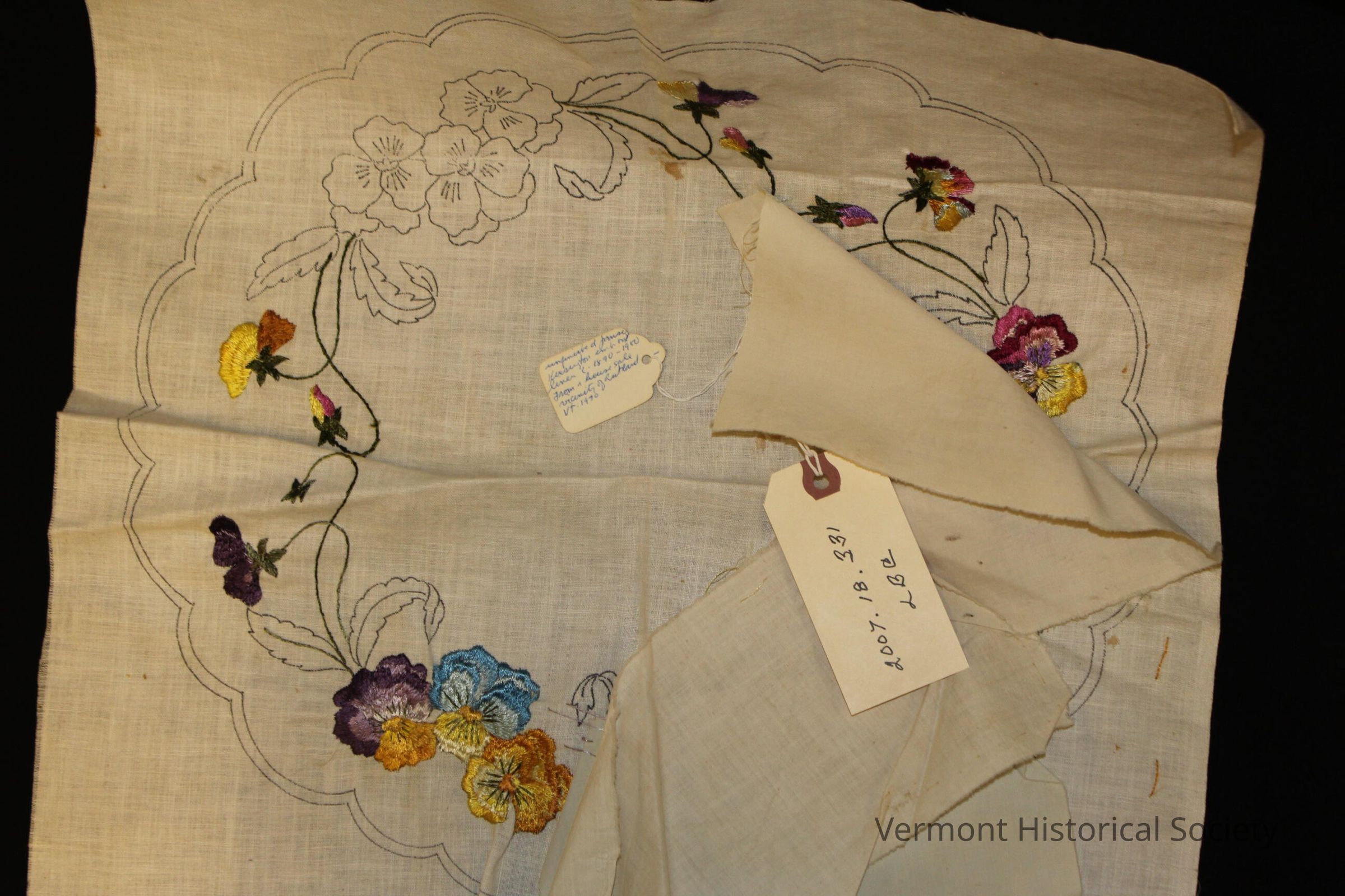 Unfinished embroidered table mat. The pattern is printed onto a piece of plain-woven cotton and consists of a wreath of pansies. The embroidery is in several colors. Rectangular pieces of fabric are basted onto the front to cover the areas of finished embroidery.