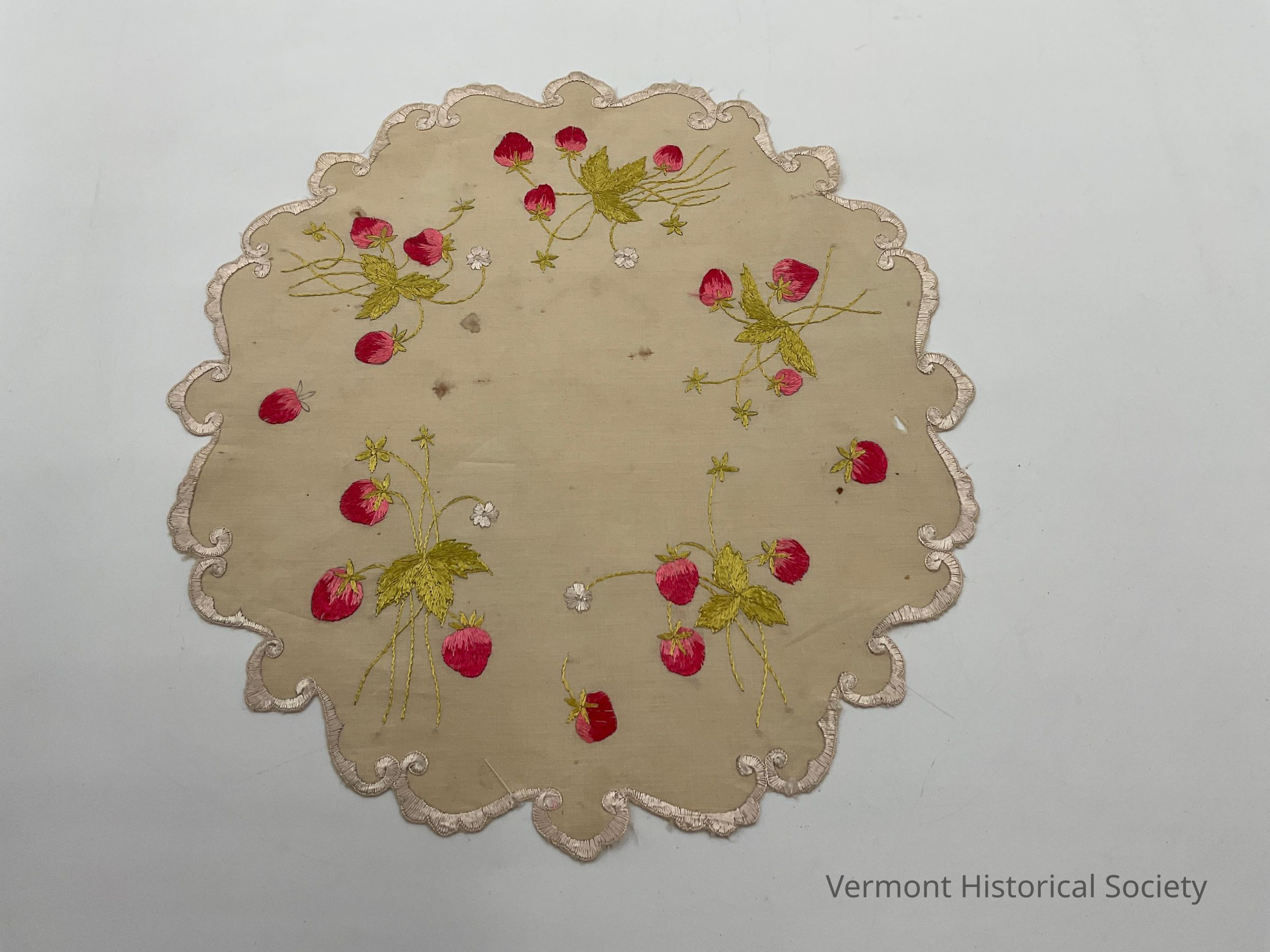 Circular flannel table mat with scalloped, embroidered edge. It is embroidered with strawberries bloom and fruit design.
