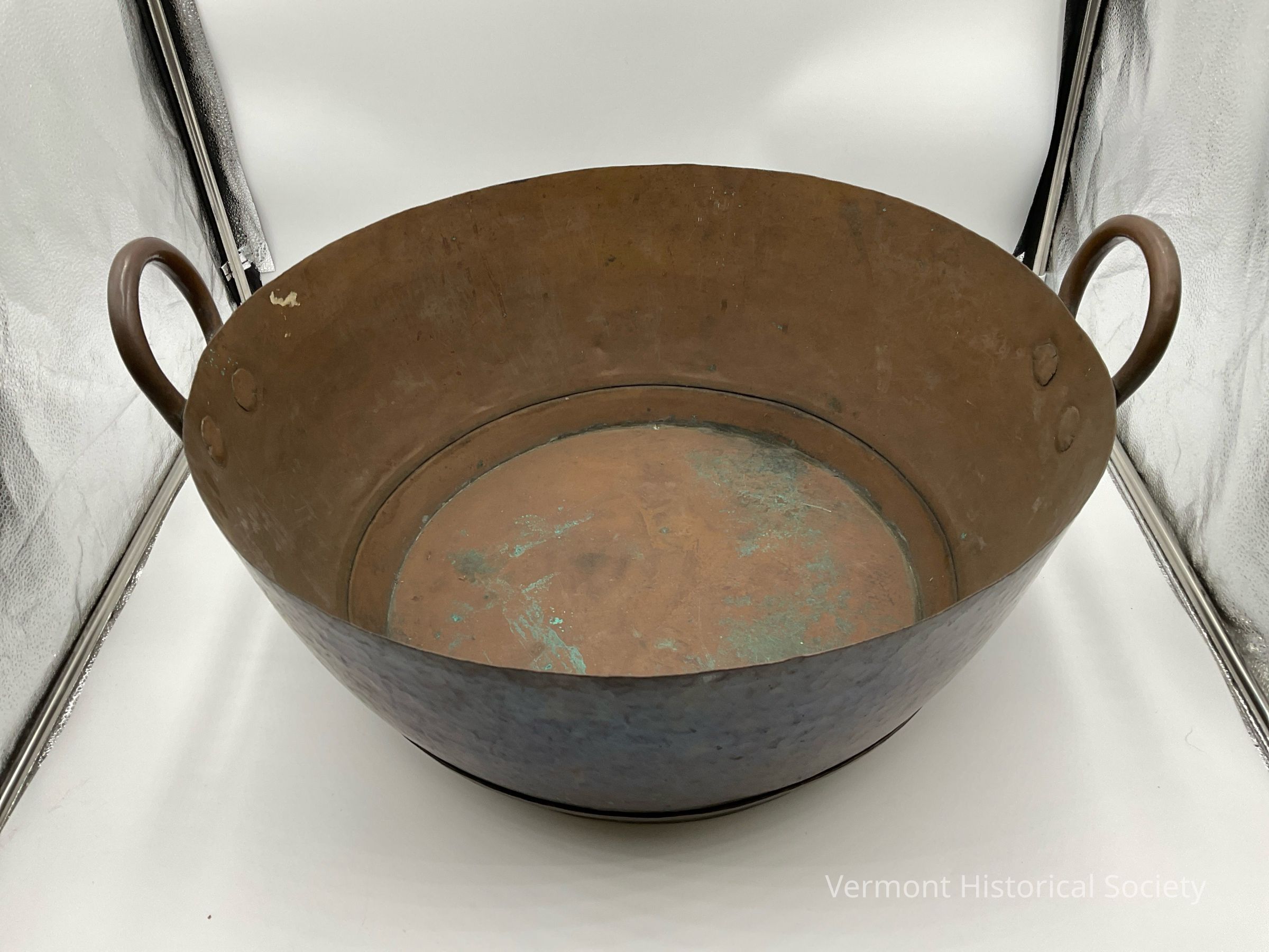 Two-handled copper tub. The basin has a flat bottom seamed to straight outward-angled sides. There are two shaped round handles with spade-shaped ends that are pinned to the sides of the basin. The basin has a hammered overall surface and dented straight upper edge.Context