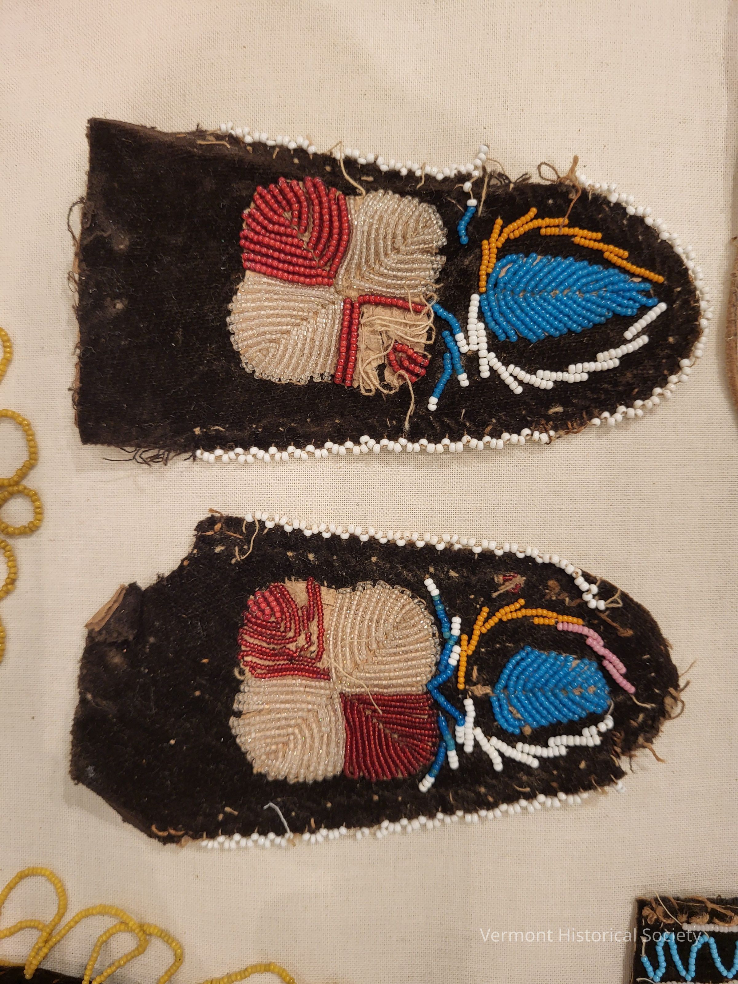 The distinctive quatrefoil design found on these vamps is indicative of Abenaki beadwork.