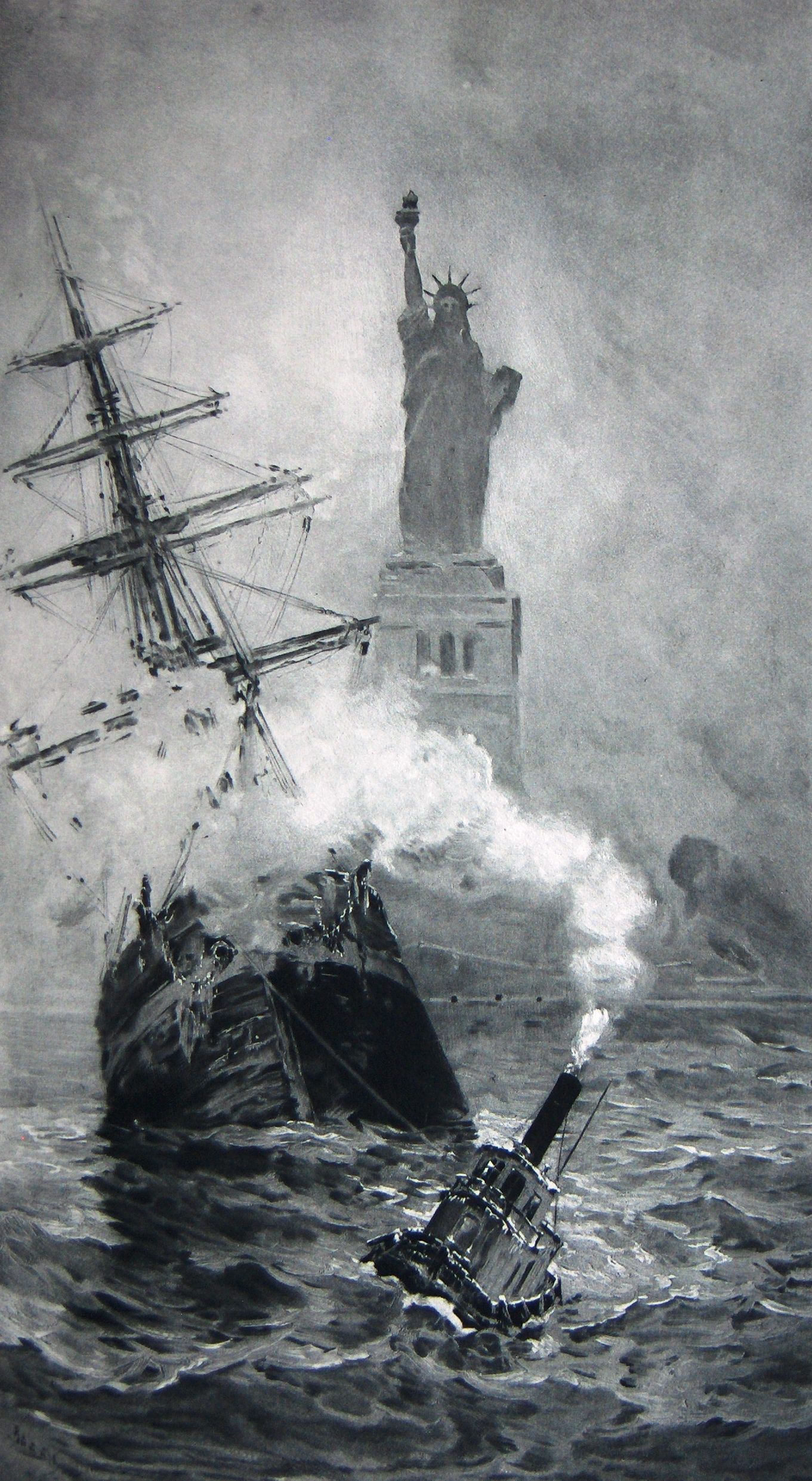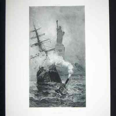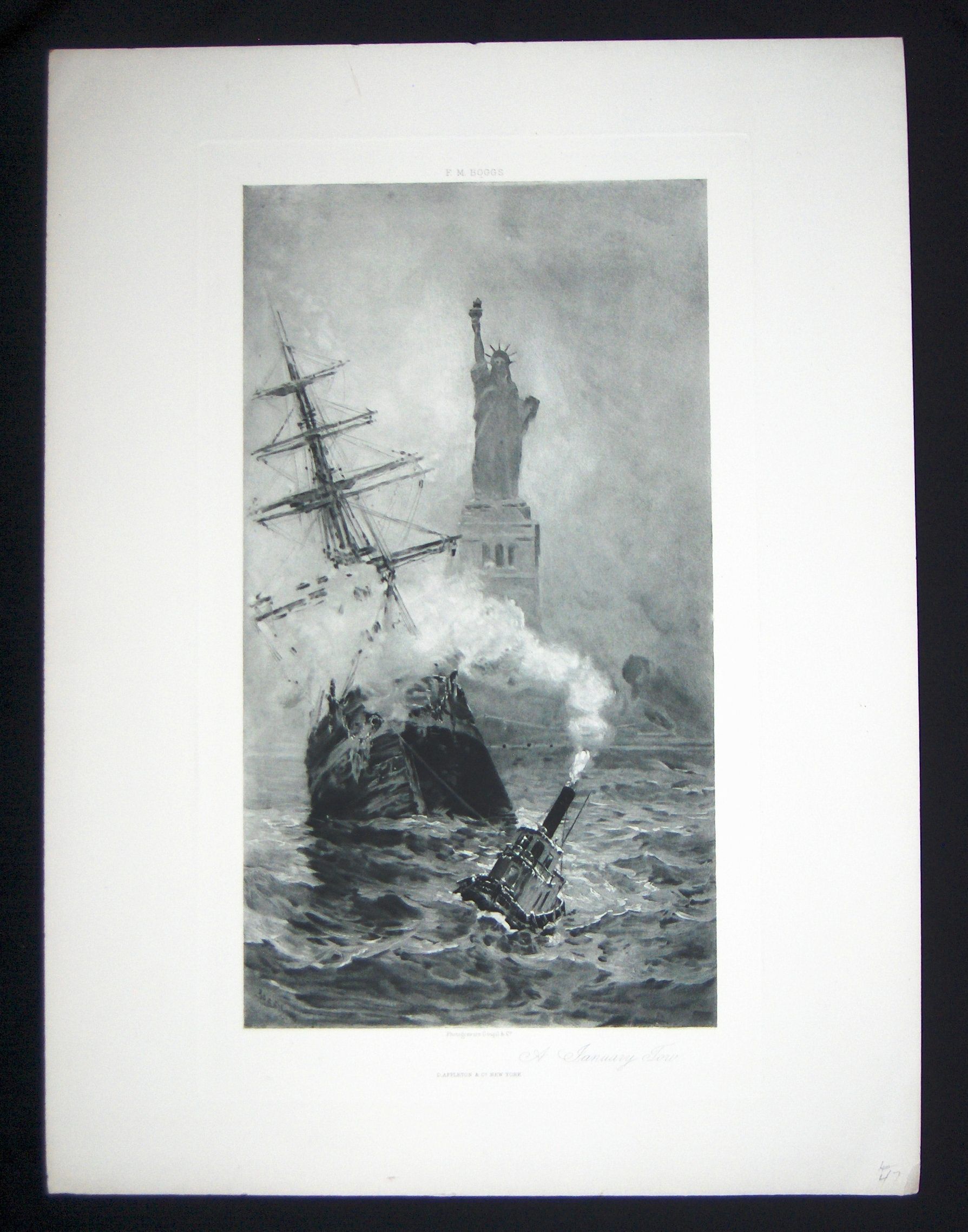Ink, Paper, Print, Lithograph, Ink, Paper, Print, Lithograph, A January Tow, Statue of Liberty, Ellis Island, Tugboat, New York Harbor, Ship, Goupil, Boggs, F.M., F.M. Boggs, Boggd, Goupil & Cie