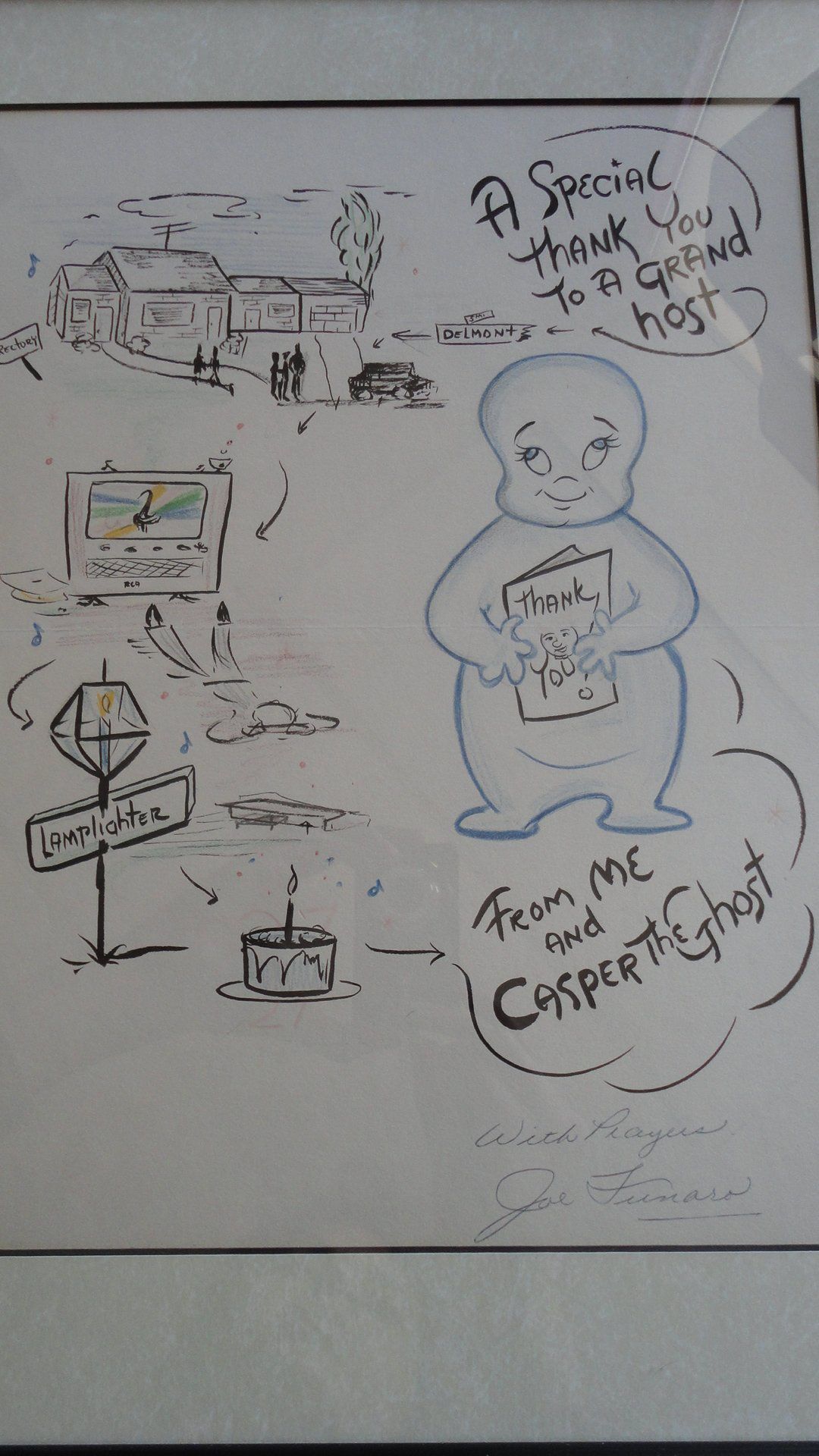 This piece apears to be a Thank you card featuring a house in Delmont, and casper the ghost. The piece reads "A special thank you to a grand host/ From me and casper the ghost"Collection