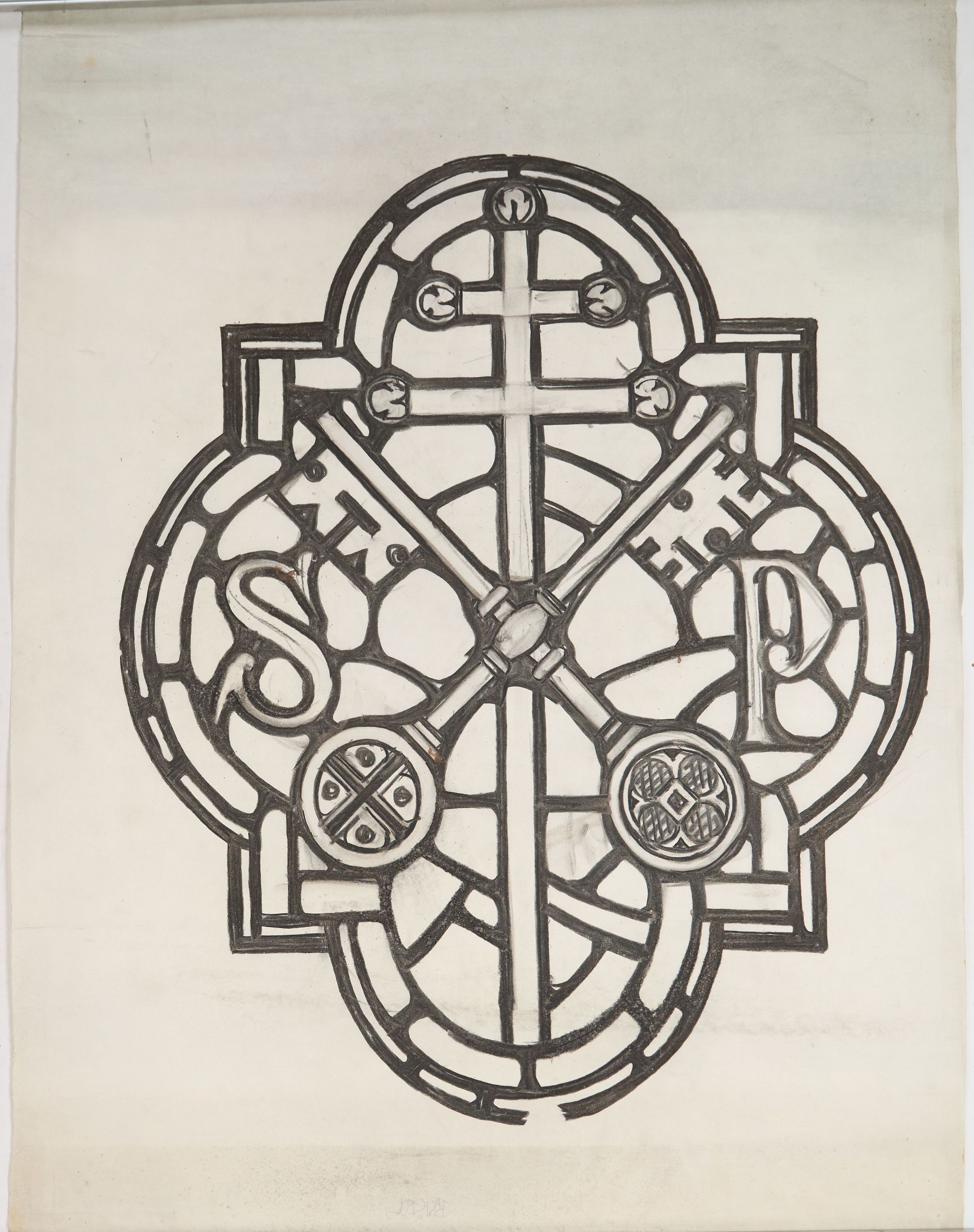 Stained glass scale cartoon, possibly St. Anne's Church in Bristol, VA. Depicts keys, representing St. Peter. The letters S and P are on either side of the keys.Type of Drawing