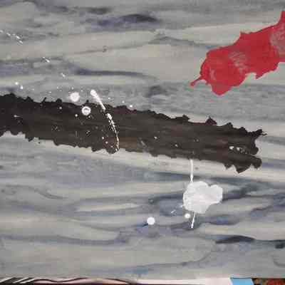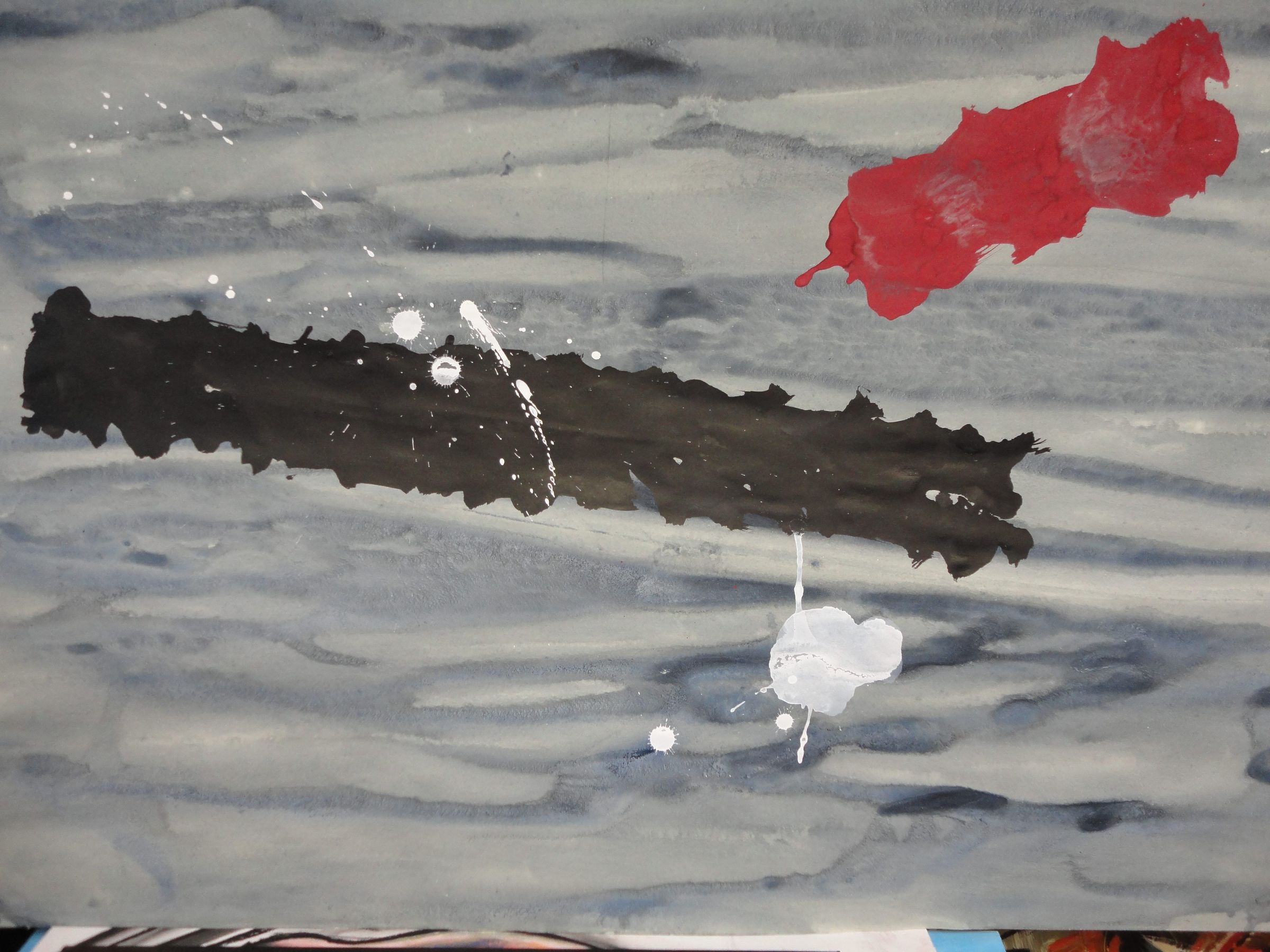 Watercolor featuring differentiating blues as a base featuring a splattering of red, white and black.Artwork Details