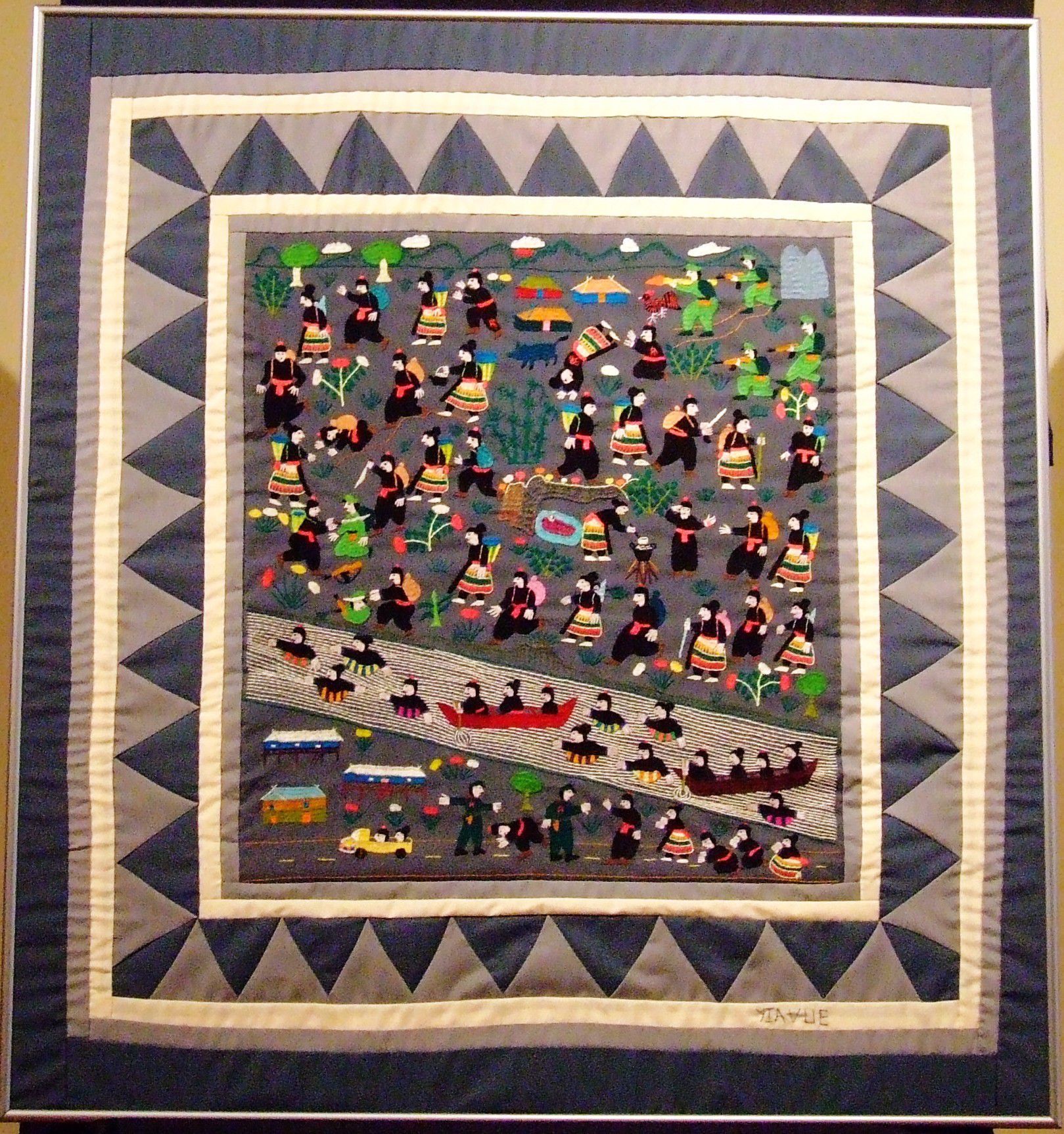 Hmong story cloth embroidered by Yia Yang Vue. Story cloths are a way for Hmong to explain their culture to non-Hmong and to the Hmong children who did not grow up in Laos. This cloth depicts the Hmong peoples tragic expulsion from Laos during the Vietnam Conflicit.Collection