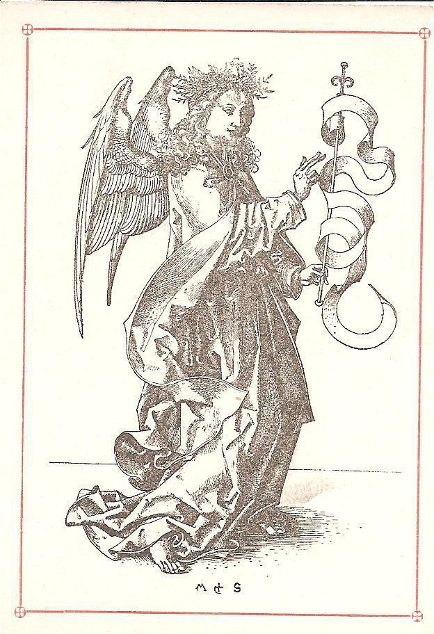 Ink, Paper, Print, Lithograph, Schongauer, Martin, Martin Schongauer, Schongauer, Albrecht Durer, Durer, Albrecht, Durer, Ink, Paper, Print, Lithograph, Prayer Cards, Religious, Religious Subject Matter, Angel, Crown