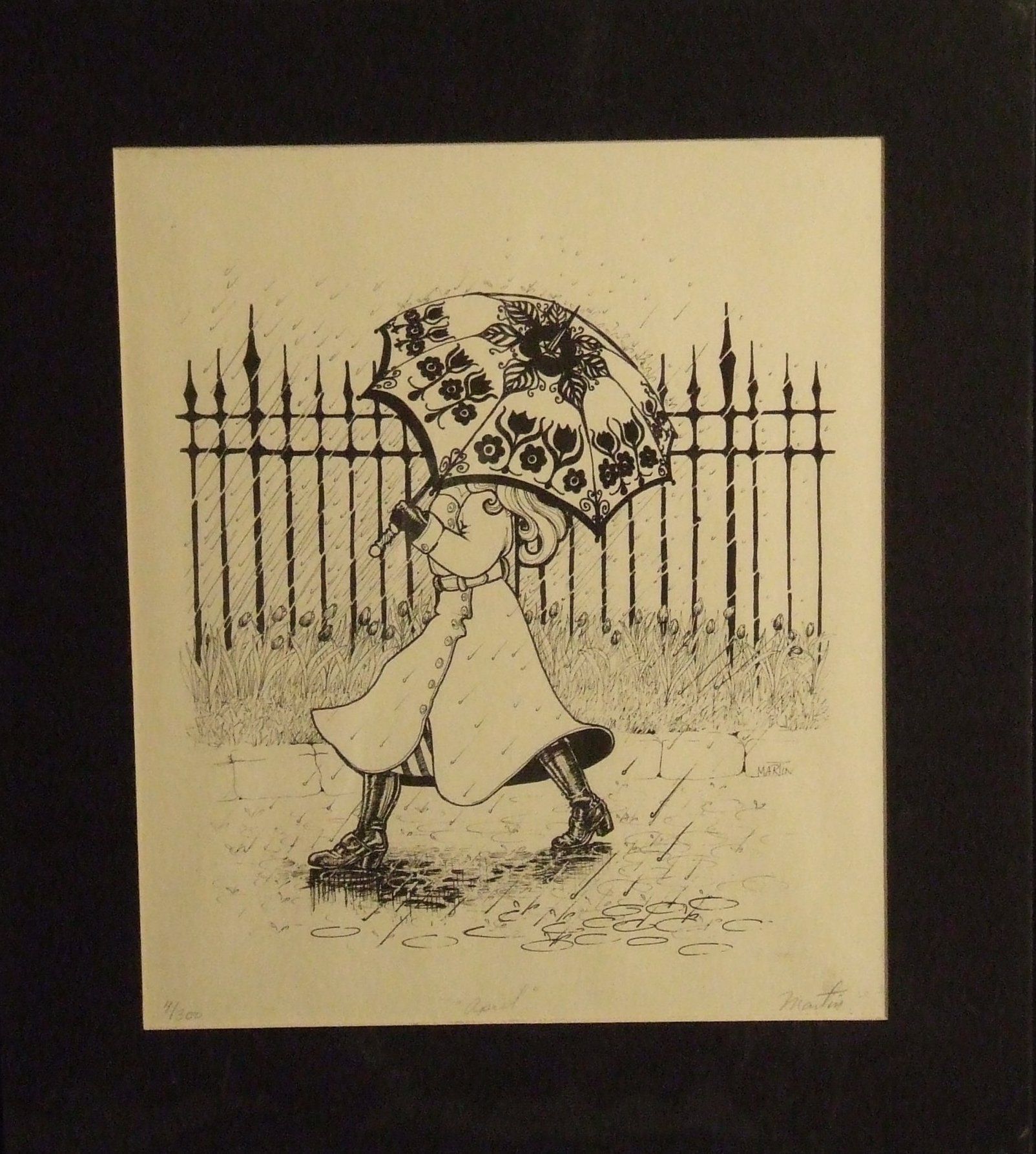 Woman, Fence, Umbrella, Rain, Ink, Paper, Print, Lithograph, Ink