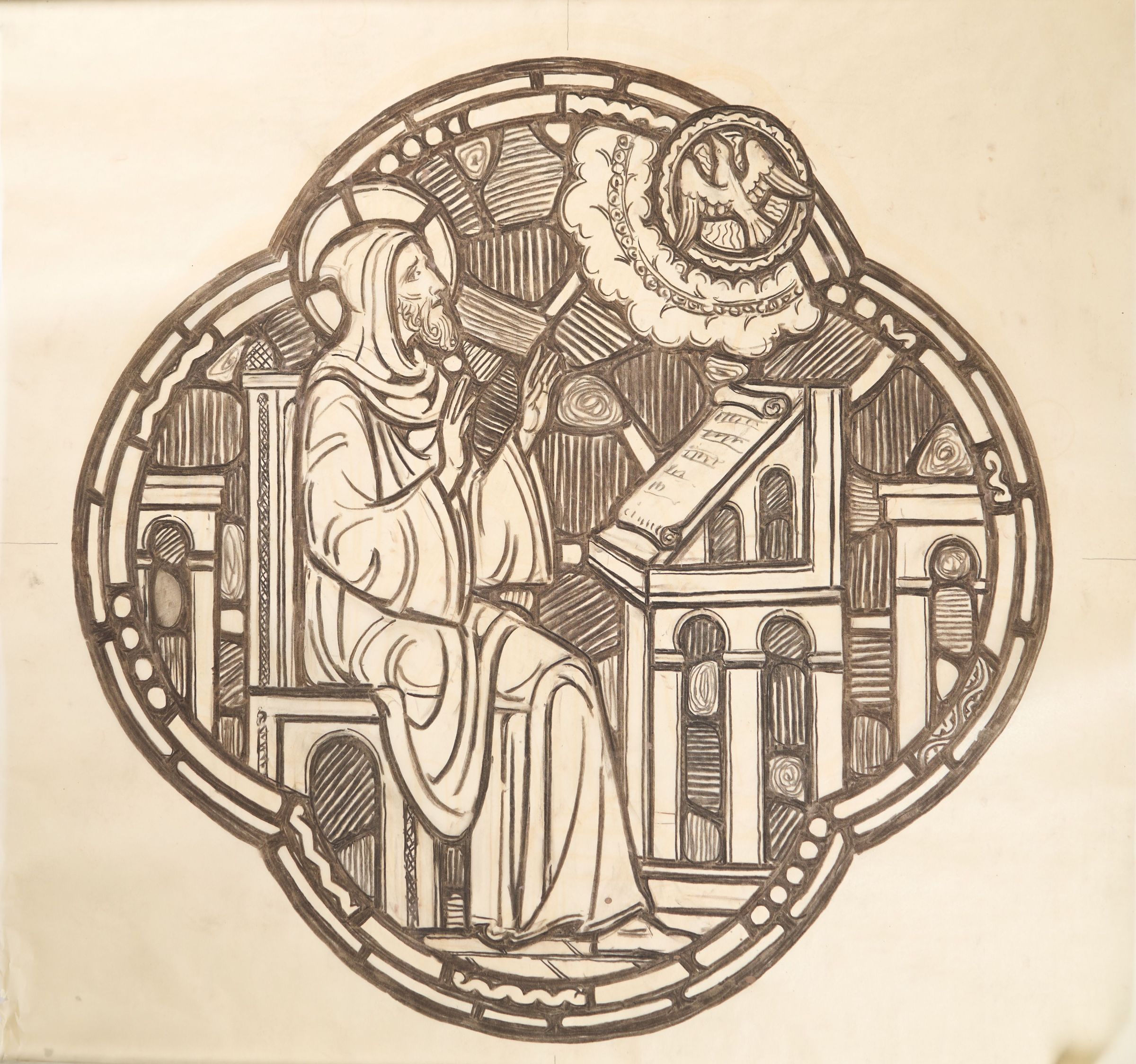 Stained glass scale cartoon, center medallion of an aisle window at St. Benedict Church, Baltimore, Maryland. Depicts St. Benedict seeing St. Scholastica's soul ascend to heaven in the form of a dove, 543 AD. For more information, see "Wheels and Roundels: Stained Glass Windows of Saint Benedict Church, Baltimore, Maryland" by Liz A. Cousins and Rt. Rev. Paschal A. Morlino, O.S.B.Type of Drawing