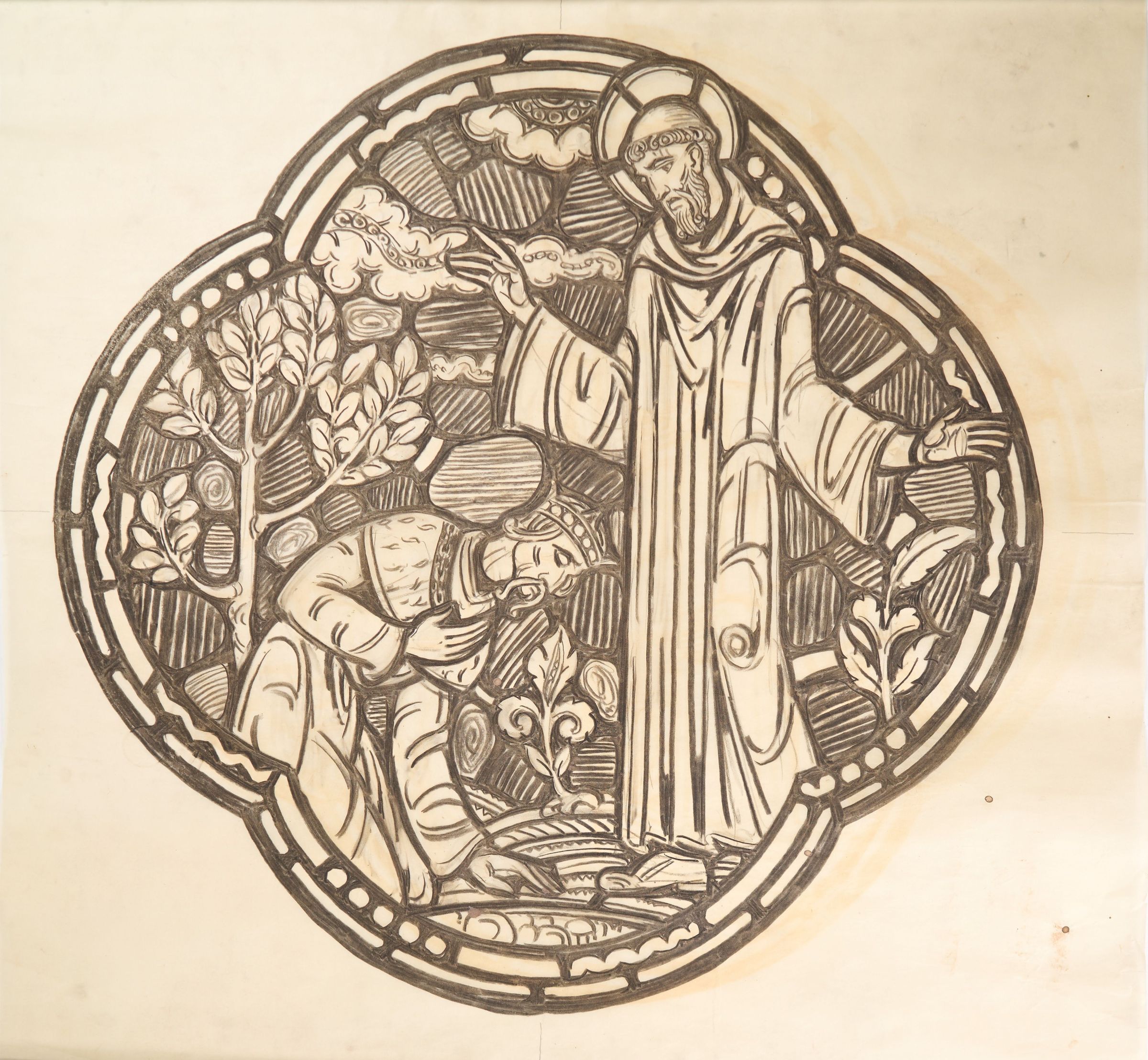 Stained glass scale cartoon, center medallion of an aisle window at St. Benedict Church, Baltimore, Maryland. Depicts the Goth King Totila kneeling before St. Benedict in 542 AD. For more information, see "Wheels and Roundels: Stained Glass Windows of Saint Benedict Church, Baltimore, Maryland" by Liz A. Cousins and Rt. Rev. Paschal A. Morlino, O.S.B.Type of Drawing
