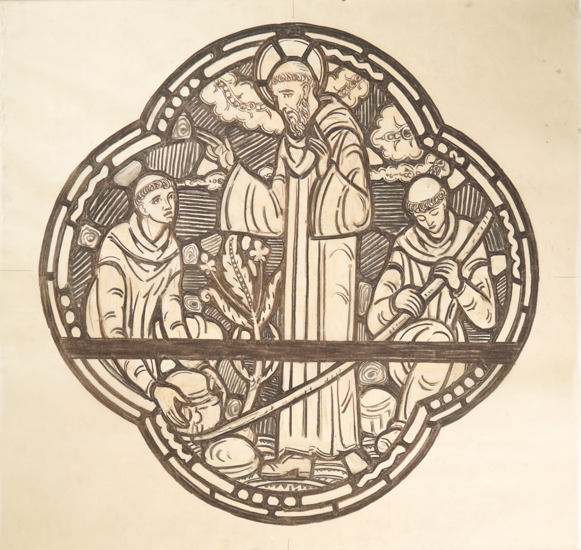 Stained glass scale cartoon, lower medallion of an aisle window at St. Benedict Church, Baltimore, Maryland. Depicts St. Benedict banishing an evil spirit from the immovable stone, allowing the monks to move it, 530 AD. For more information, see "Wheels and Roundels: Stained Glass Windows of Saint Benedict Church, Baltimore, Maryland" by Liz A. Cousins and Rt. Rev. Paschal A. Morlino, O.S.B.Type of Drawing