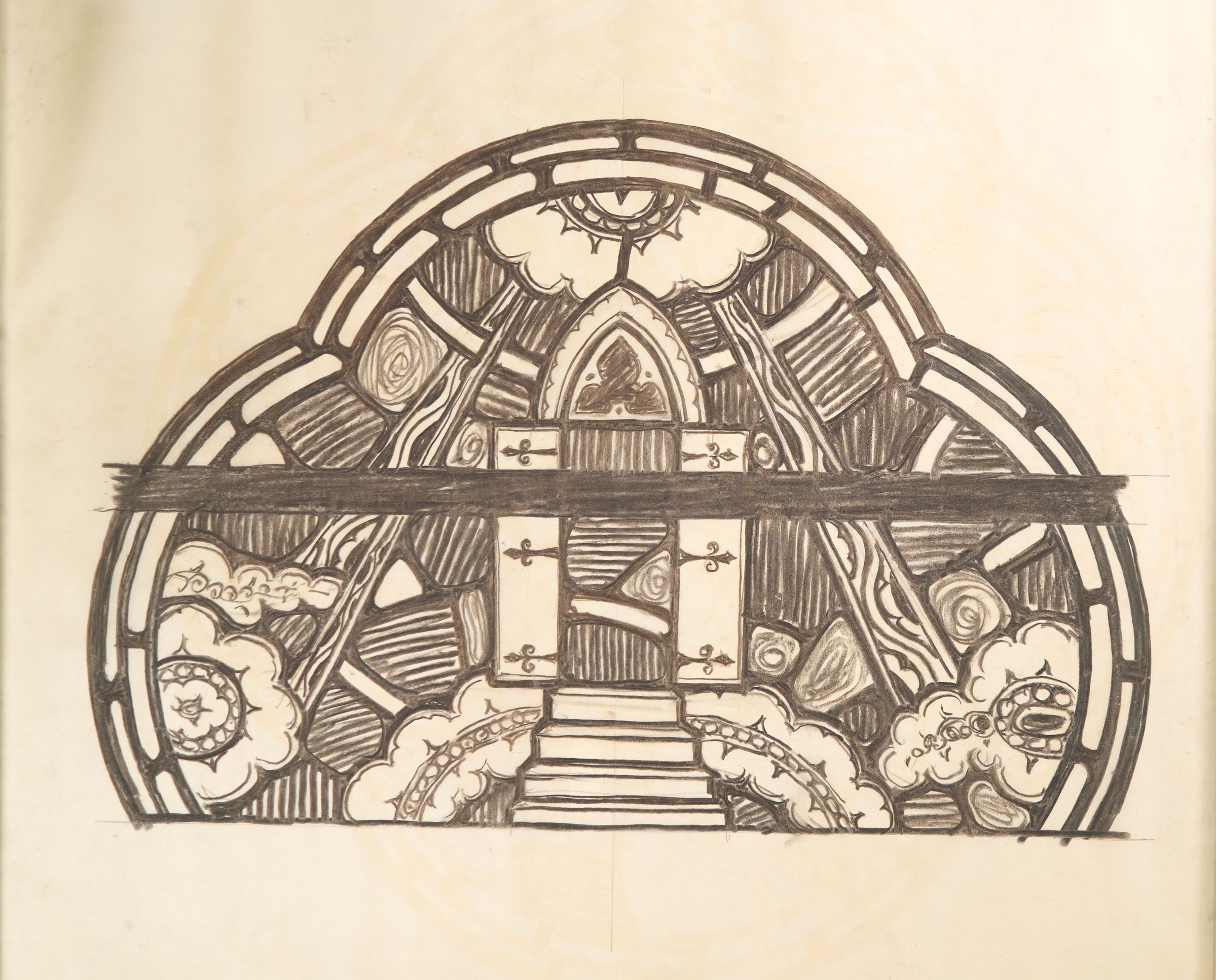 Stained glass scale cartoon, lower medallion of a confessional window at St. Benedict Church, Baltimore, Maryland. The upper medallion of this window depicts the Prodigal Son. This medallion depicts a door, or the gates of heaven. For more information, see "Wheels and Roundels: Stained Glass Windows of Saint Benedict Church, Baltimore, Maryland" by Liz A. Cousins and Rt. Rev. Paschal A. Morlino, O.S.B.Type of Drawing