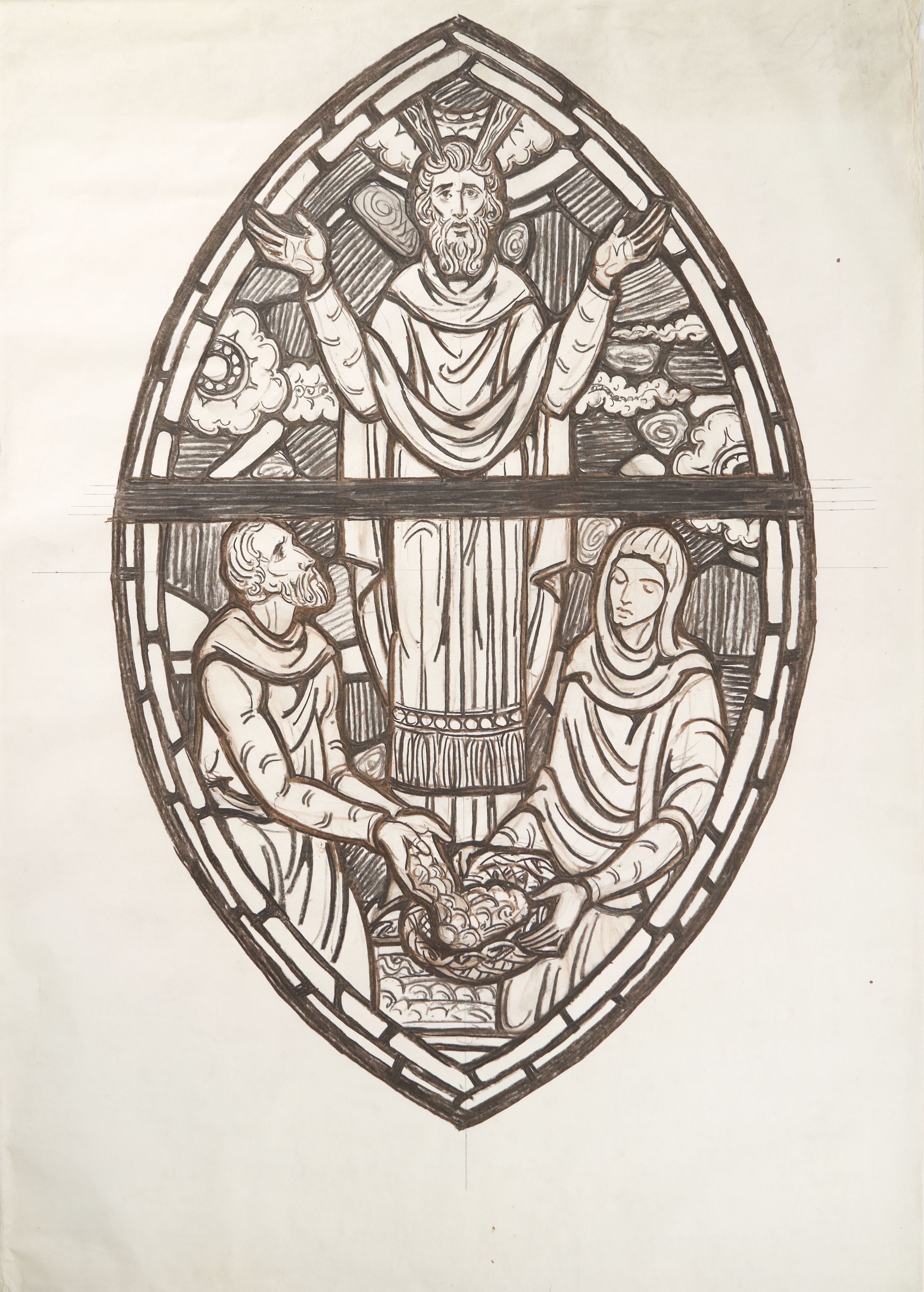Stained glass scale cartoon, lower medallion of Old Testament-themed altar window at St. Benedict Church, Baltimore, Maryland. Depicts an unknown scene with Moses. For more information, see "Wheels and Roundels: Stained Glass Windows of Saint Benedict Church, Baltimore, Maryland" by Liz A. Cousins and Rt. Rev. Paschal A. Morlino, O.S.B.Type of Drawing
