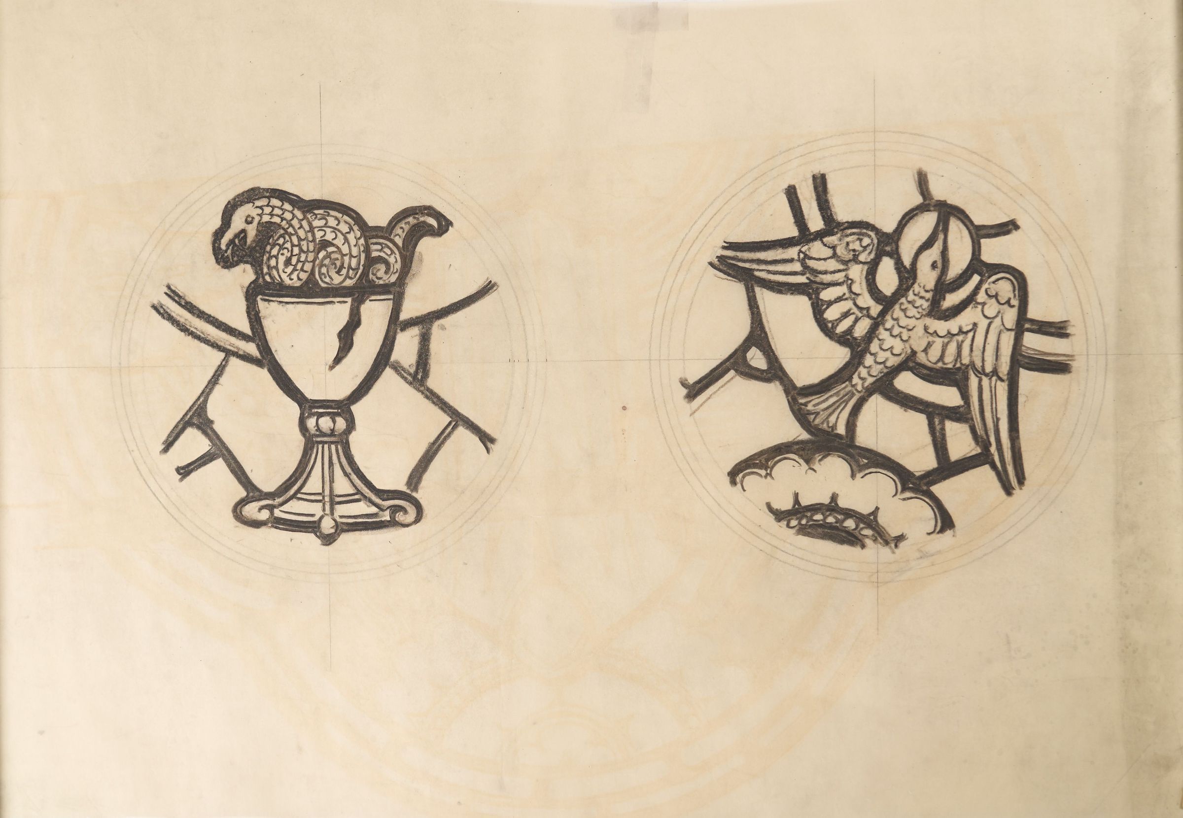 Stained glass scale cartoon, roundels for lunette or transom windows at St. Benedict Church, Baltimore, Maryland. Depicts the poisoned chalice of Vicovaro, from the Life of St. Benedict, and the dove of St. Scholastica, ascending to Heaven. For more information, see "Wheels and Roundels: Stained Glass Windows of Saint Benedict Church, Baltimore, Maryland" by Liz A. Cousins and Rt. Rev. Paschal A. Morlino, O.S.B.Type of Drawing