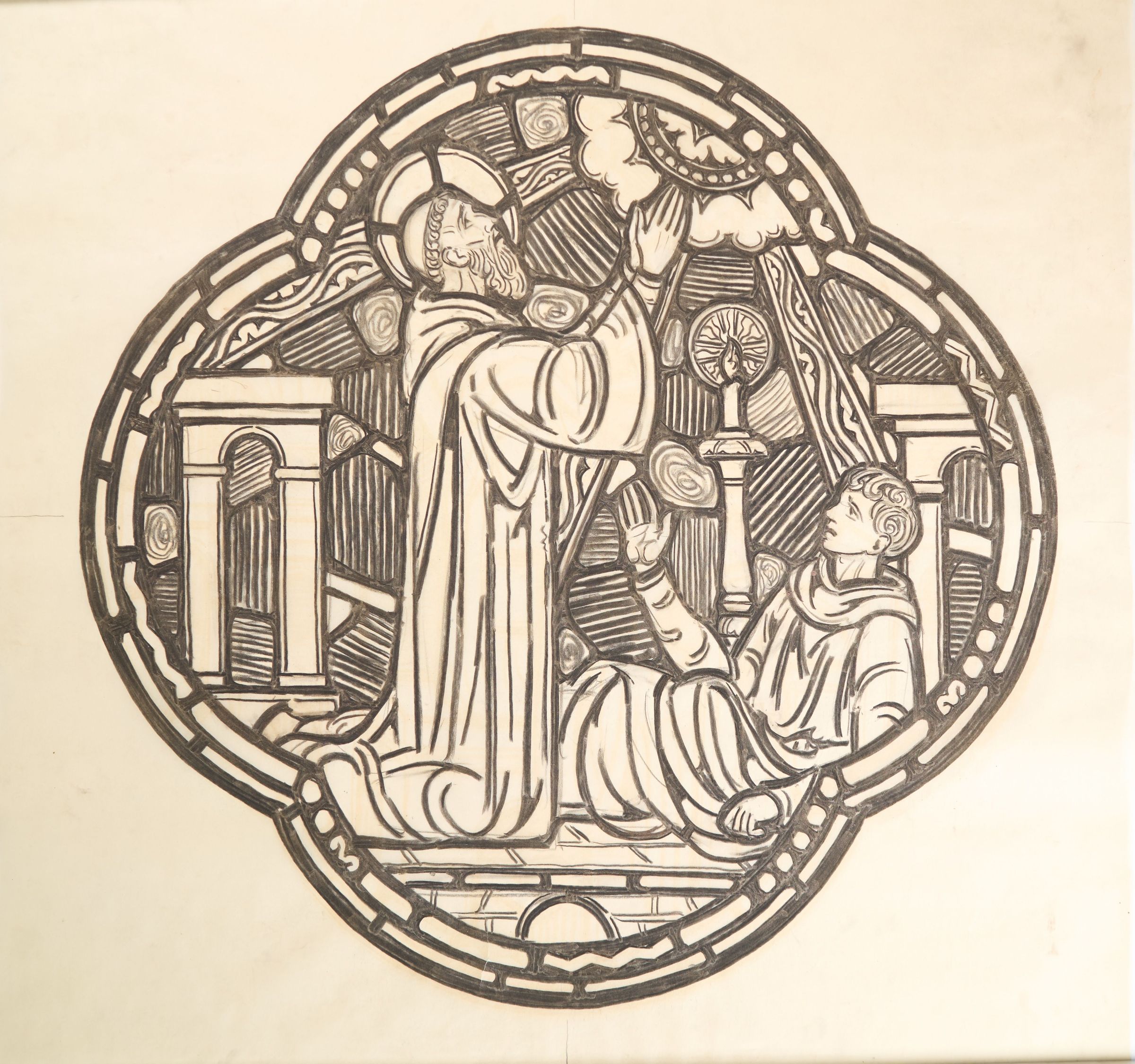 Stained glass scale cartoon, medallion of an aisle window at St. Benedict Church, Baltimore, Maryland. Depicts St. Benedict praying for a monk. For more information, see "Wheels and Roundels: Stained Glass Windows of Saint Benedict Church, Baltimore, Maryland" by Liz A. Cousins and Rt. Rev. Paschal A. Morlino, O.S.B.Type of Drawing