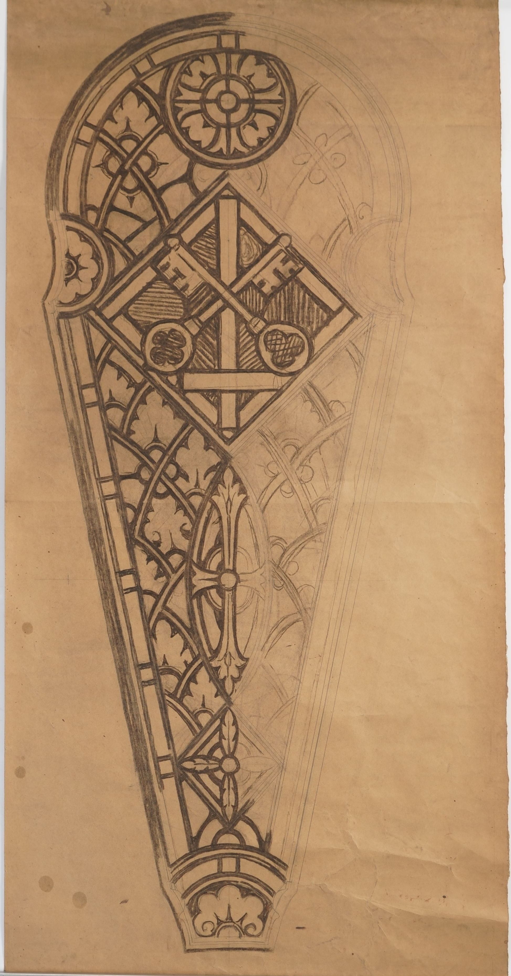 Stained glass scale cartoon, light of rose window at St. Benedict Church, Baltimore, Maryland. Depicts keys and an upside down cross, representing St. Peter. For more information, see "Wheels and Roundels: Stained Glass Windows of Saint Benedict Church, Baltimore, Maryland" by Liz A. Cousins and Rt. Rev. Paschal A. Morlino, O.S.B.Type of Drawing