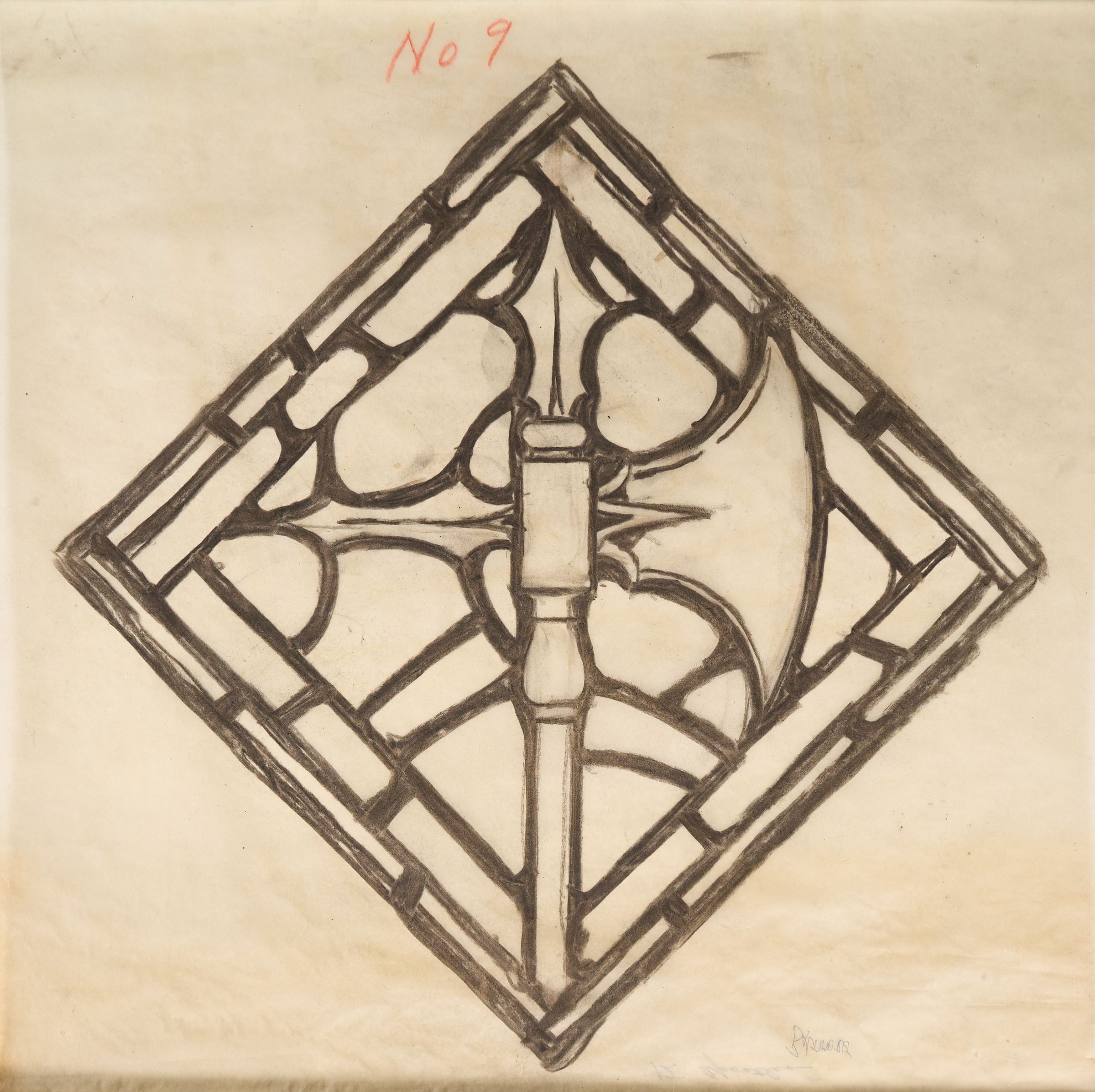 Stained glass scale cartoon, part of rose window at St. Benedict Church, Baltimore, Maryland. Depicts an axe representing St. Matthias. For more information, see "Wheels and Roundels: Stained Glass Windows of Saint Benedict Church, Baltimore, Maryland" by Liz A. Cousins and Rt. Rev. Paschal A. Morlino, O.S.B.Type of Drawing