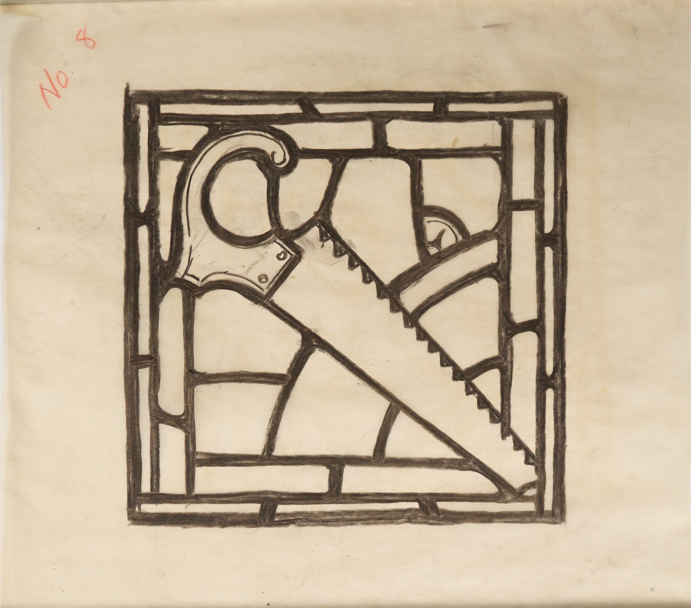 Stained glass scale cartoon, part of rose window at St. Benedict Church, Baltimore, Maryland. Depicts a saw representing St. James the Less. For more information, see "Wheels and Roundels: Stained Glass Windows of Saint Benedict Church, Baltimore, Maryland" by Liz A. Cousins and Rt. Rev. Paschal A. Morlino, O.S.B.Type of Drawing