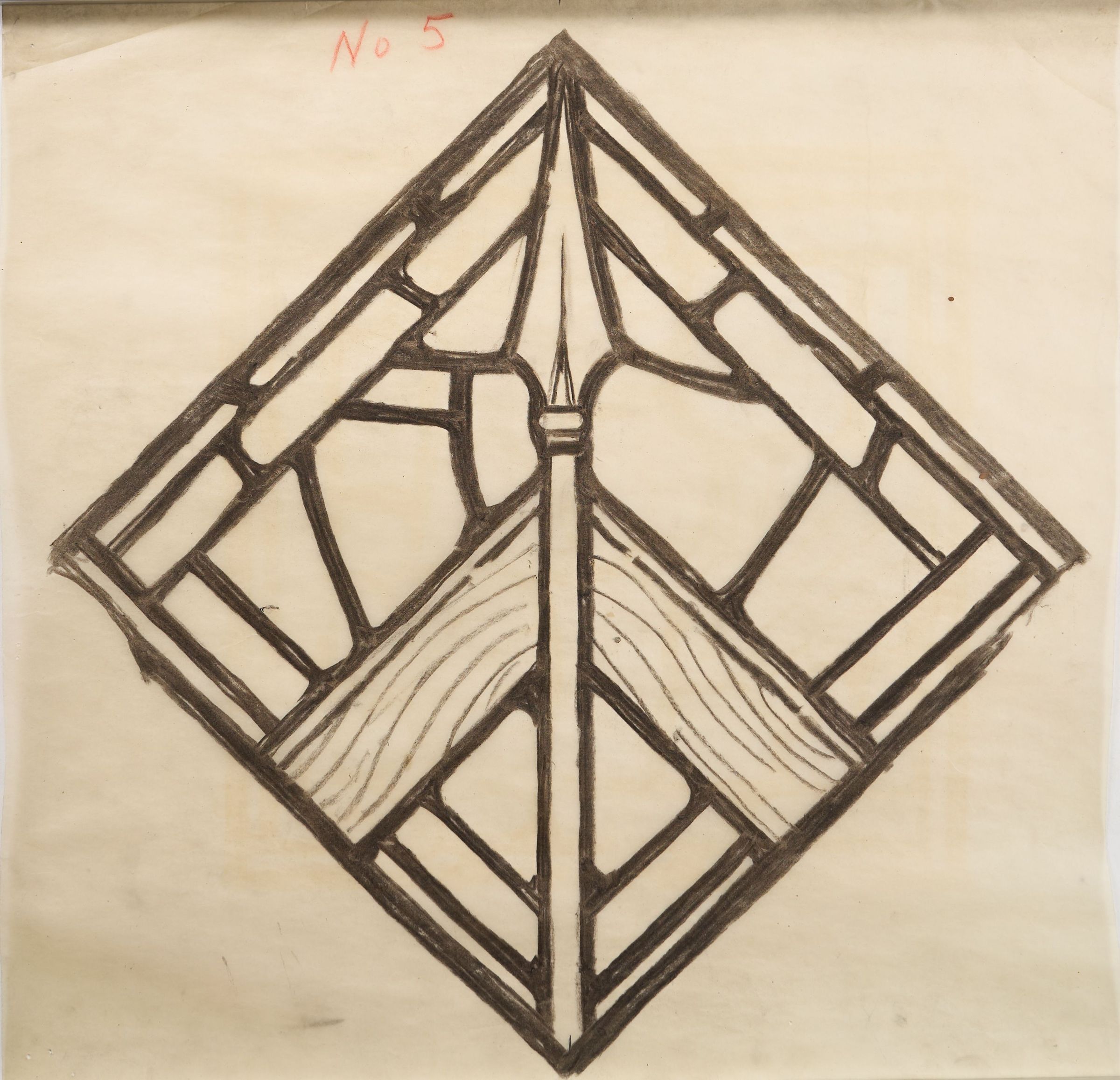 Stained glass scale cartoon, part of rose window at St. Benedict Church, Baltimore, Maryland. Depicts a carpenter's square and spear, representing St. Thomas the Apostle. For more information, see "Wheels and Roundels: Stained Glass Windows of Saint Benedict Church, Baltimore, Maryland" by Liz A. Cousins and Rt. Rev. Paschal A. Morlino, O.S.B.Type of Drawing