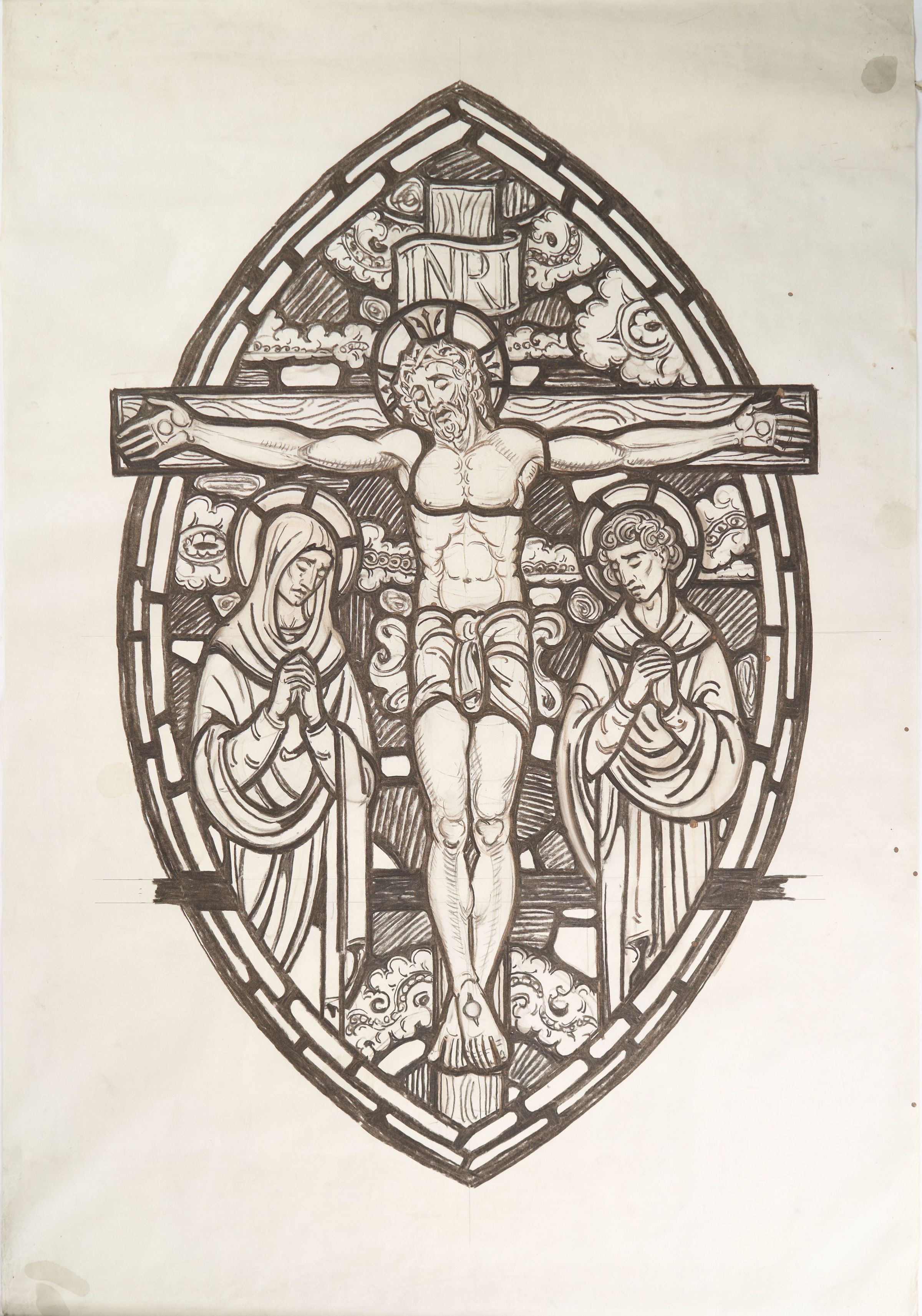 Stained glass scale cartoon, upper medallion of New Testament-themed altar window at St. Benedict Church, Baltimore, Maryland. Depicts Christ on the cross. For more information, see "Wheels and Roundels: Stained Glass Windows of Saint Benedict Church, Baltimore, Maryland" by Liz A. Cousins and Rt. Rev. Paschal A. Morlino, O.S.B.Type of Drawing