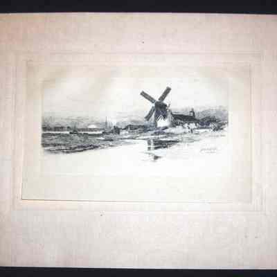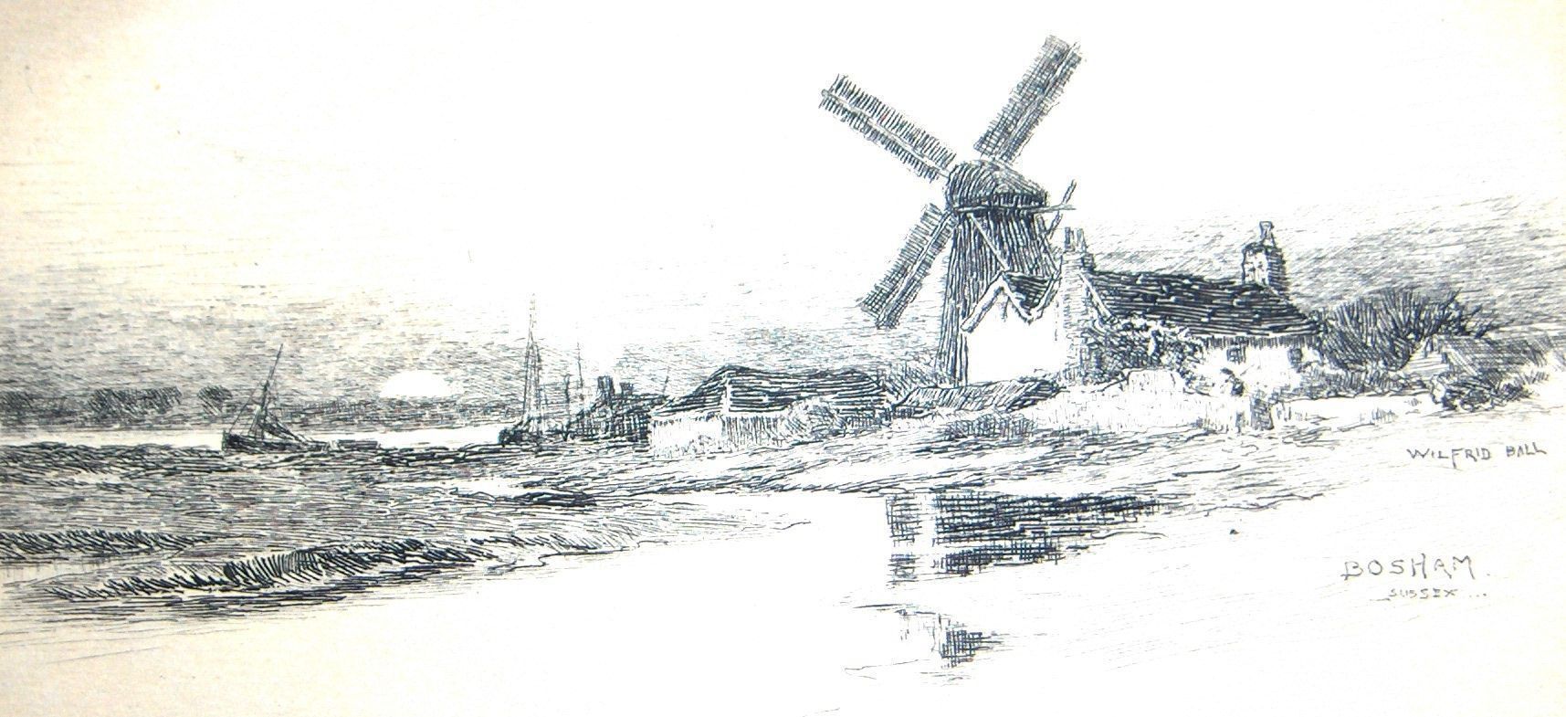 Engraving, Artwork, Ink, Ball,Wilfred Williams, Ball, Ball,Wilfred, Bosham, Sussex, Sea, Windmill, England, Britian, Engraving, Artwork, Ink