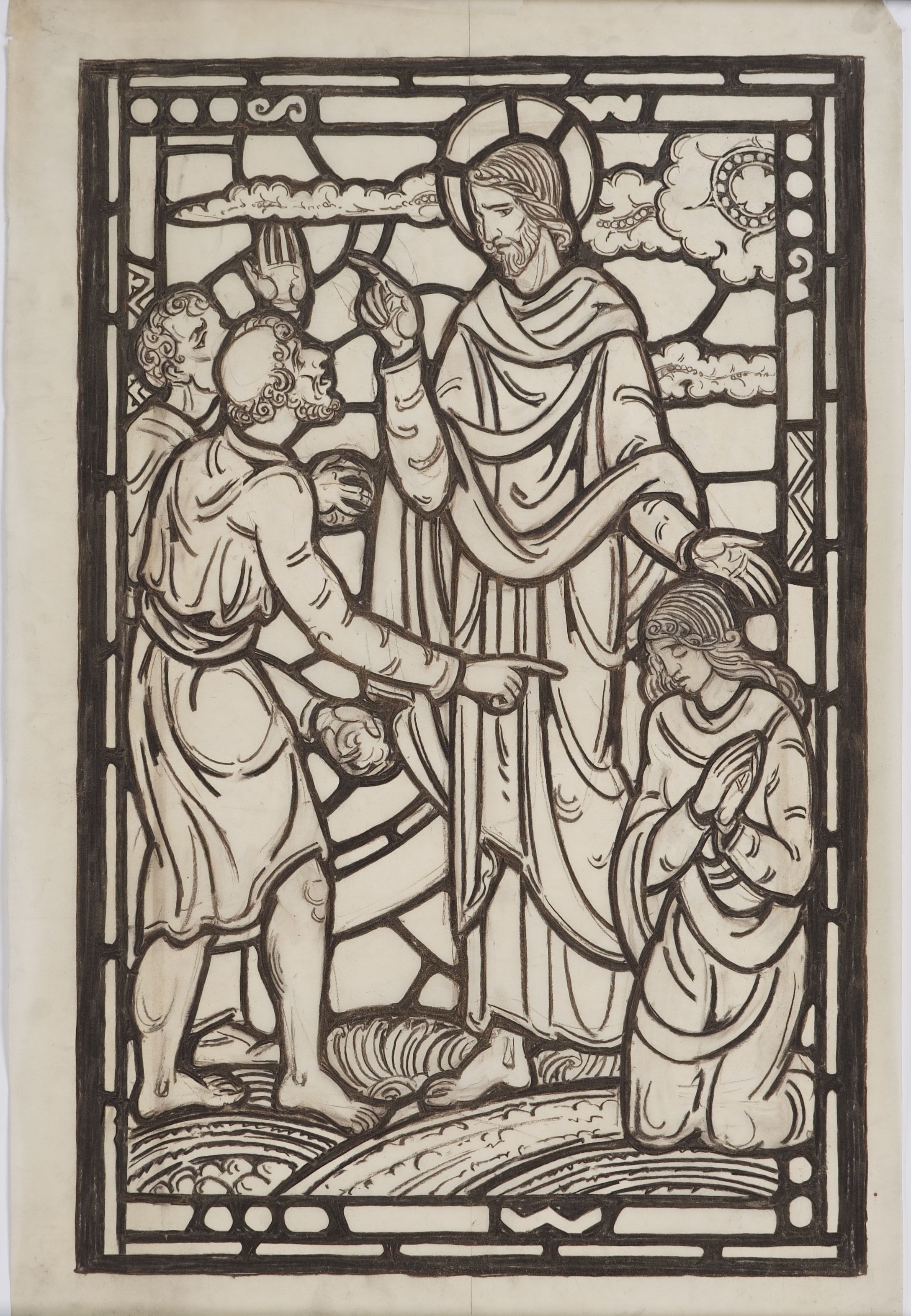 Stained glass scale cartoon, aisle window side light panel at Myers Park United Methodist Church in Charlotte, NC. Depicts Christ with stone-bearing two men and a kneeling woman. Likely the story of Christ and the woman taken in adultery, from John 7:53-8:11.Type of Drawing
