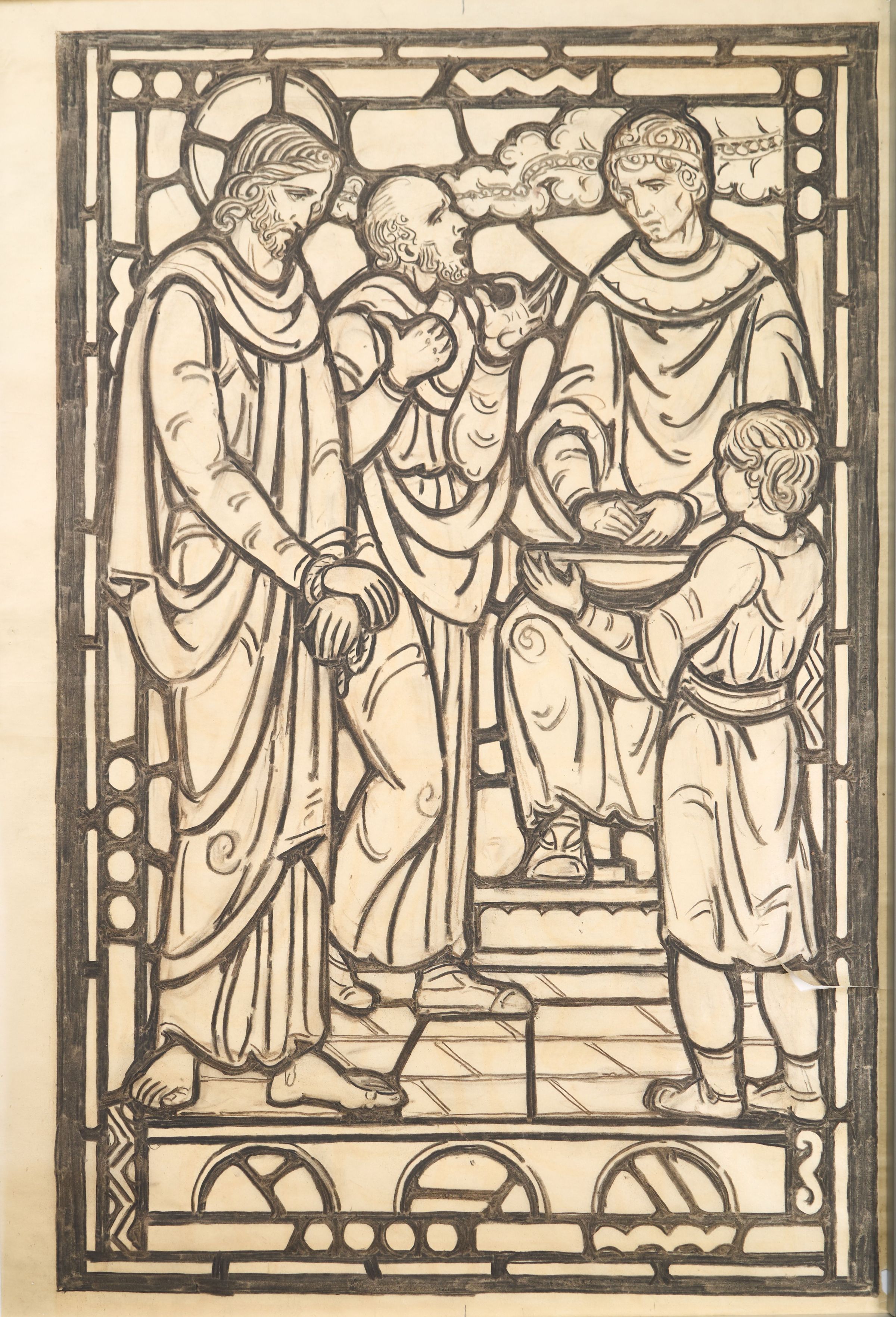 Stained Glass scale cartoon, aisle window side light panel at Myers Park United Methodist Church in Charlotte, NC. Depicts Christ handcuffed before the Sanhedrin.Type of Drawing