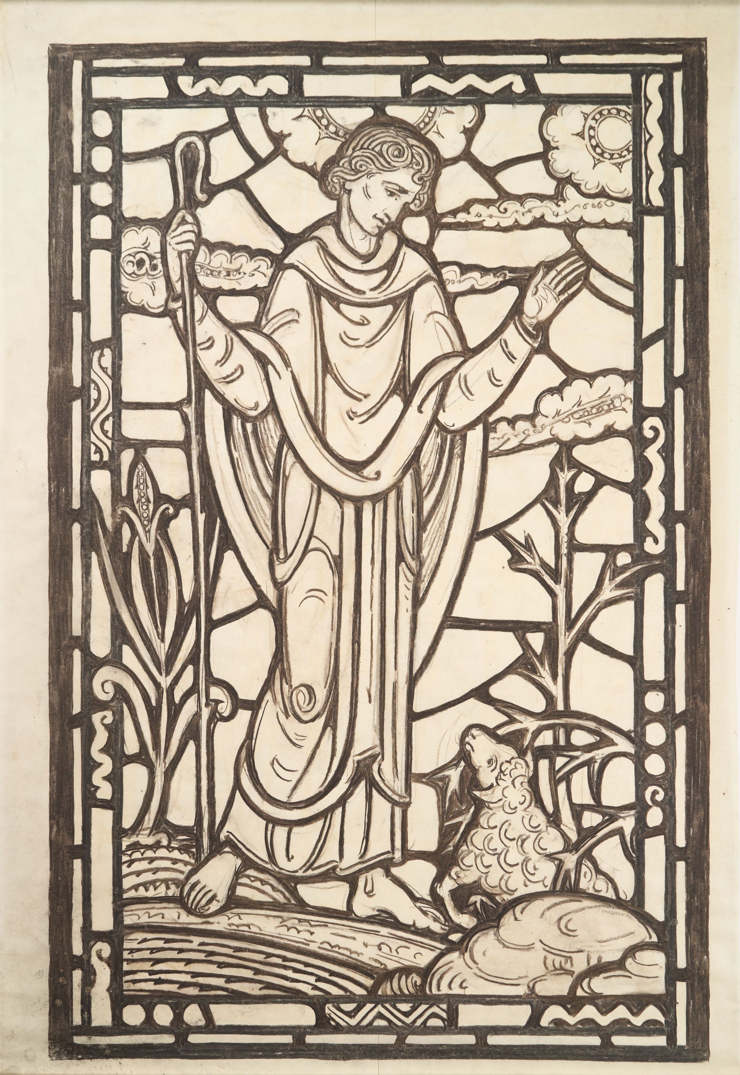Stained Glass scale cartoon, aisle window side light panel at Myers Park United Methodist Church in Charlotte, NC. Depicts the Good Shepard holding a crozier with a lamb in a field.Type of Drawing