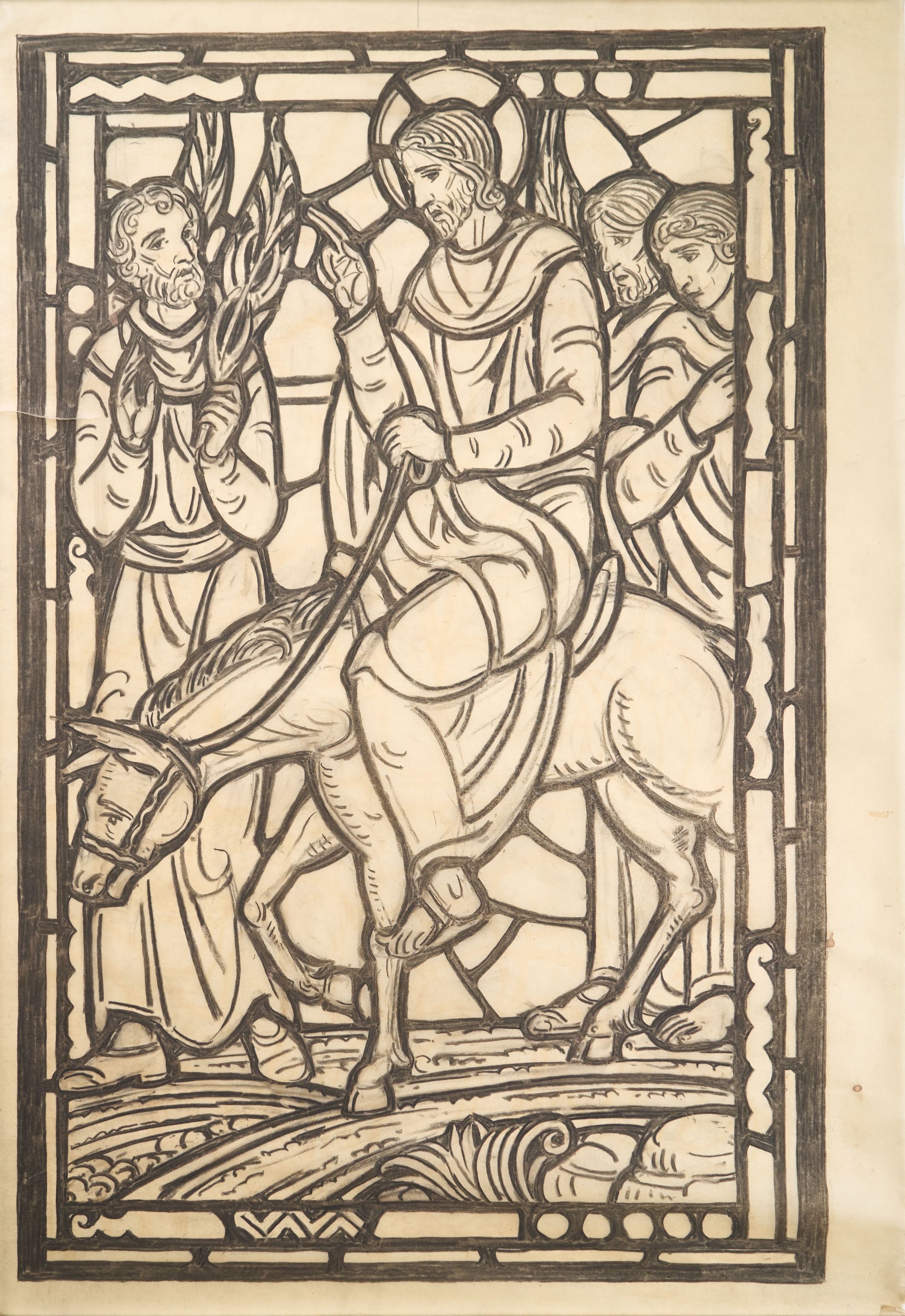 Stained Glass scale cartoon, aisle window side light panel at Myers Park United Methodist Church in Charlotte, NC. Depicts Christ's Triumphal Entry into Jerusalem. Christ is seated on a donkey and onlookers hold palm leaves.Type of Drawing