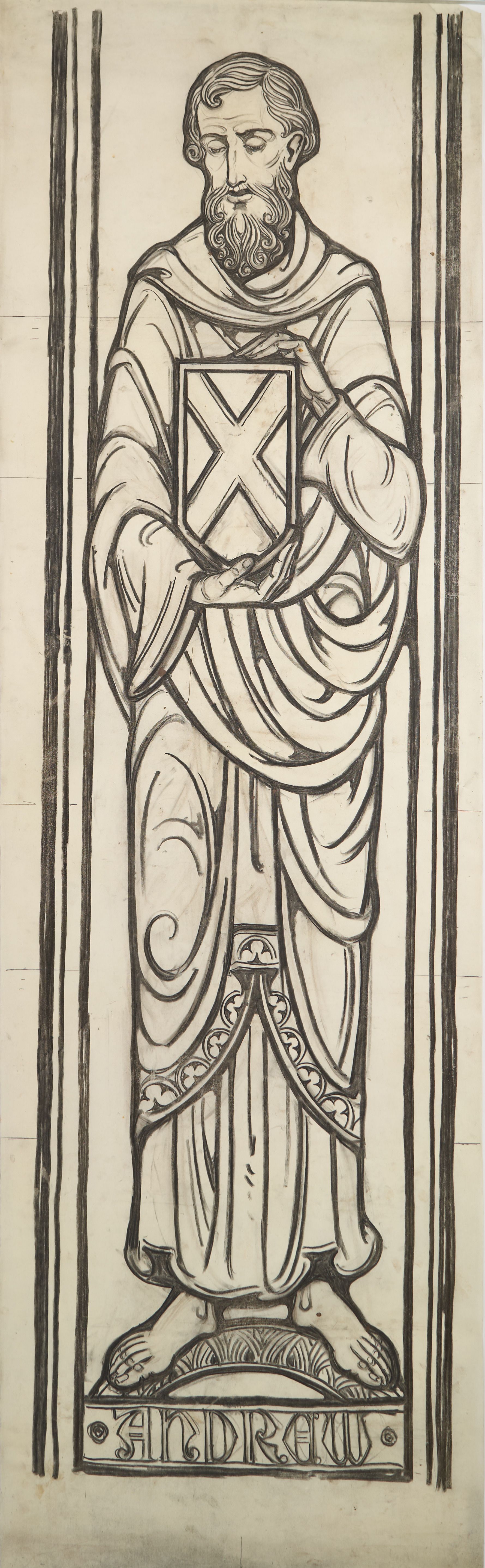 Stained glass scale cartoon, center light of aisle window at Myers Park United Methodist Church in Charlotte, North Carolina. Depicts St. Andrew holding a shield with an X on it, alluding to his crucifixion on an X-shaped crucifix.Type of Drawing