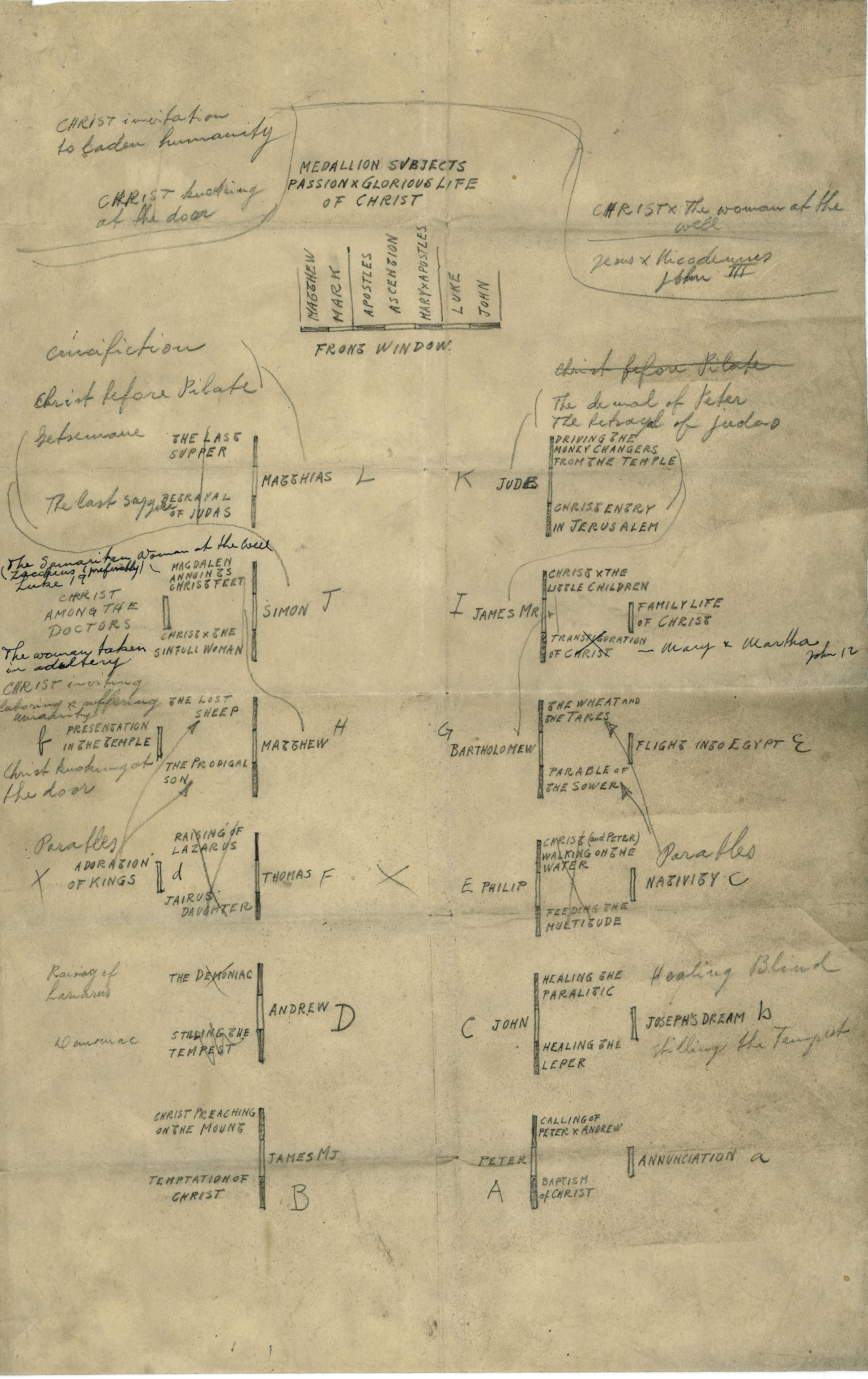 Diagram of windows and their depictions at Myers Park Methodist Church, Charlotte, NC. The three lines are the clerestory windows, the single lines near the clerestory windows are the aisle windows, and the seven bars along the top is the front entrance window.Type of Drawing
