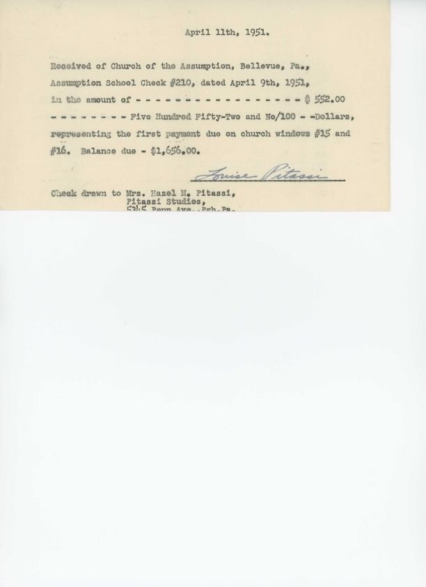 Check receipt for $552 from Church of the Assumption to Hazel Pitassi for two windows.Collection