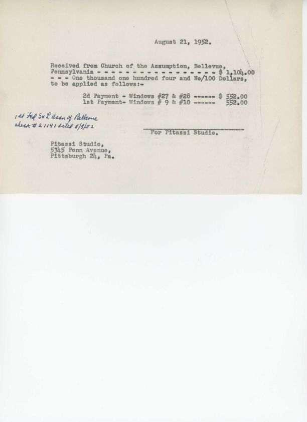 Check receipt for $1,104 from Church of the Assumption to Pitassi Studios for four windows.Collection