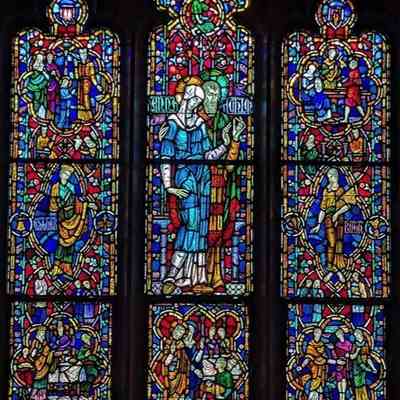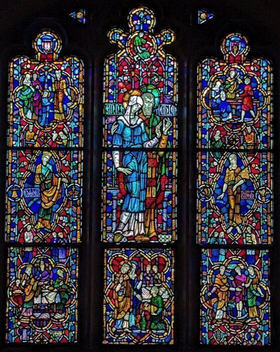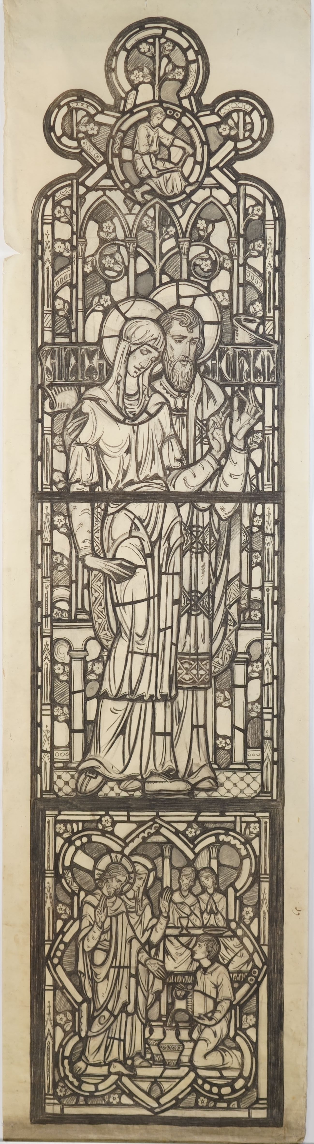 Stained glass scale cartoon, aisle window in St. Gregory the Great Catholic Church, Chicago, IL. This is the center light of the Matrimony window. Depictions from top to bottom: a man with a tool; Anna and Joachim, parents of the Blessed Virgin Mary; the Feast at Cana.