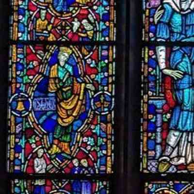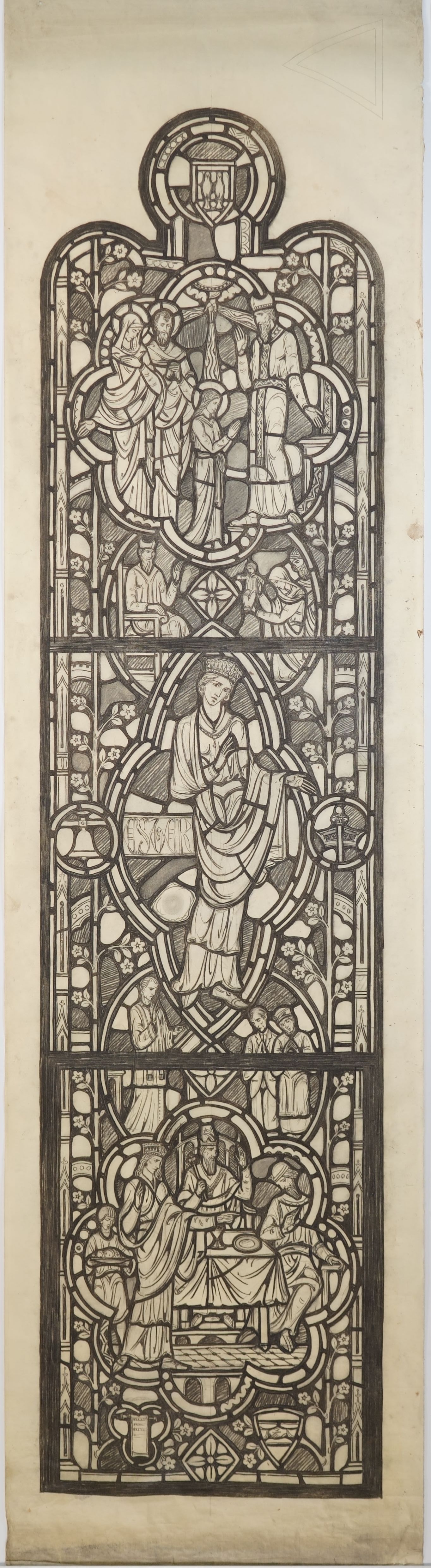 Stained glass scale cartoon, aisle window in St. Gregory the Great Catholic Church, Chicago, IL. This is the left light of the Matrimony window. Depictions from top to bottom: a pair of birds; the Presentation of the Blessed Virgin Mary; the Presentation of Christ at the temple; a figure of Esther, next to a bell and crown and dagger; a priest wedding a couple; the feast of Esther, where Esther reveal's Haman's plan to exterminate the Jews from Persia.