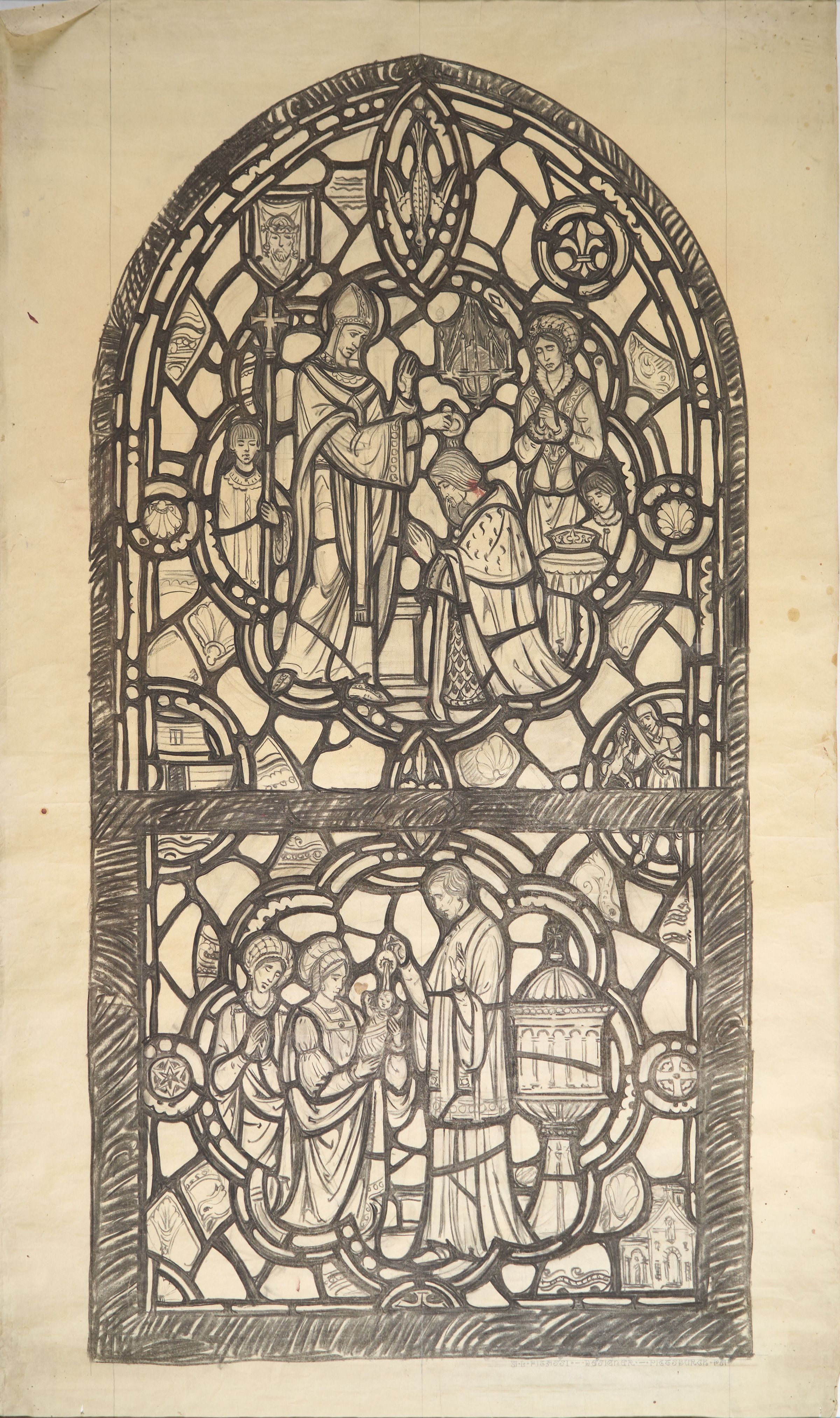 Stained glass scale cartoon, two medallions for the right light of the Baptistry window at St. Gregory the Great Catholic Church in Chicago, Illinois. Depictions from top to bottom: the Baptism of Clovis I, King of the Franks, by St. Remigius; the Baptism of St. Mechtild.