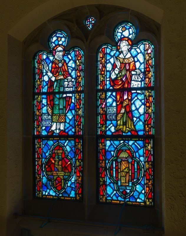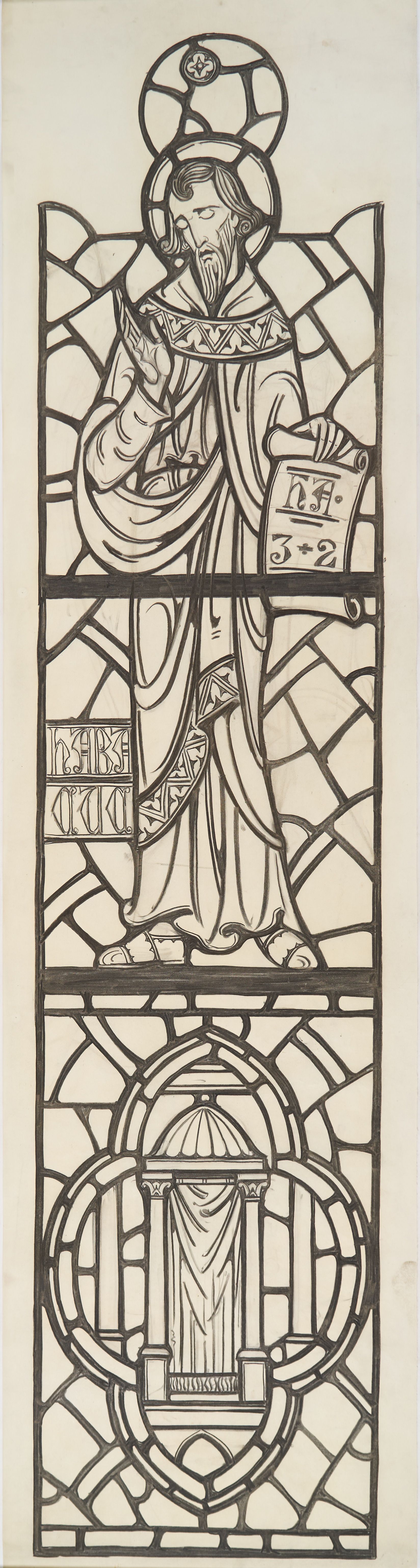 Stained glass scale cartoon for window in St. Gregory the Great Catholic Church, Chicago, IL. This is the right light of the third window from the sanctuary on the epistle side of the upper nave. Depictions from top to bottom: Habacuc or Habakkuk holding a scroll on which is written "HA 3+2" ("O Lord, I have heard your renown, / and am in awe, O Lord, of your work. / In the course of years revive it, / in the course of years make yourself known; / in your wrath remember compassion!"); a temple.